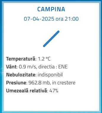 Luni, 7 aprilie 2025. În Prahova, la ora 21.00, se înregistrau temperaturi ca în miezul iernii adevărate, la multe stații meteorologice din județ. De departe, la Vârful Omu, era cel mai frig. Aproape de minus 18 grade, iar la stația meteo de la cota 1500 din Sinaia erau minus 9 grade. Nici în cele două municipii ale Prahovei nu era prea confortabilă temperatura de afară, la Ploiești fiind 1,1 grade Celsius, iar la Câmpina doar 1,2 grade Celsius. Se anunță o noapte cu temperaturi scăzute, care vor coborî cu siguranță sub limita înghețului și în zona de șes a Prahovei.