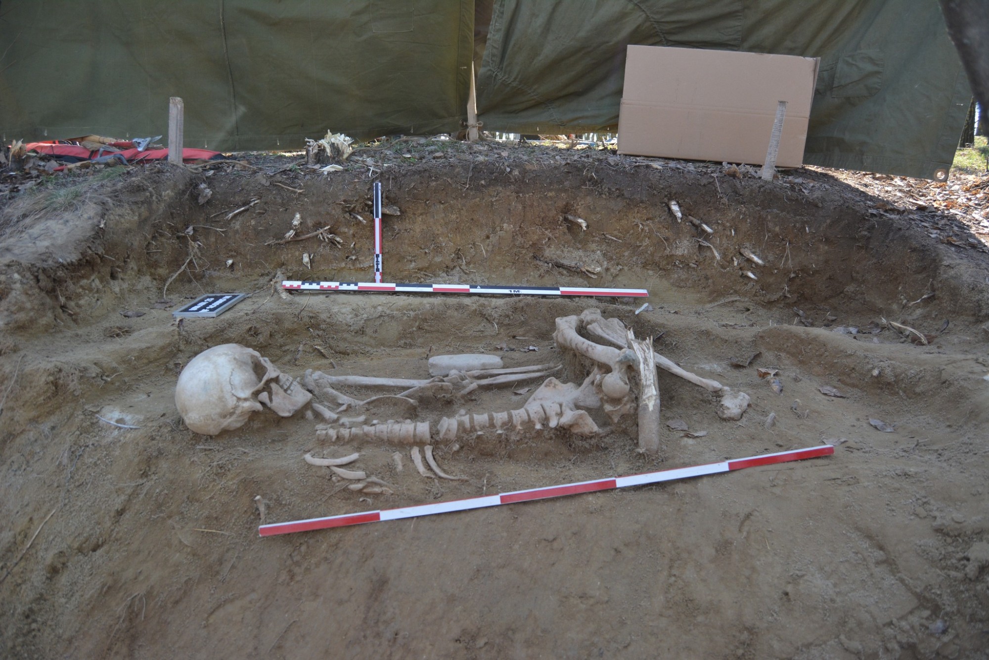 ”În luna martie, un colectiv de arheologi din cadrul Muzeului Județean de Istorie și Arheologie Prahova format din Alin Frînculeasa, Octav Negrea și Eduard Ghinea s-a deplasat pe teren pentru a cerceta zona în care au apărut oasele umane. În urma intervenței arheologice a fost descoperit un schelet uman parțial prăbușit în râpa naturală odată cu pâmântul desprins. Oasele, cu o stare de conservare excepțională, aparțineau unui individ adult, de sex masculin, depus în mormânt conform tradițiilor de înmormântare ale comunităților umane din preistorie. Defunctul fusese așezat dorsal cu membrele inferioare îndoite și brațele pe lângă corp. Craniul era orientat spre est. În apropierea brațului stâng avea depusă o piesă din piatră lungă de aproape 20 cm care ar putea reprezenta un topor. Au fost descoperite și două mici fragmente ceramice care par să indice locuirea acestui deal într-o perioadă chiar mai veche decât mormântul identificat. Având o vechime estimată de circa cinci milenii, mormântul este unul preistoric, putând fi atribuit perioadei timpurii a epocii bronzului. Aflat în apropierea sitului de pe Dealul Merez (sat Șoimești) în care muzeul din Ploiești derulează săpături arheologice sistematice din anul 2014, zona în care a fost descoperit mormântul și o posibilă așezare poate să devină una foarte importantă pentru perioada preistorică a Munteniei, urmând să continuăm cercetările în paralel cu cele de pe Dealul Merez situat la mai puțin de 1 km est de Vârful Scoruș”, mai precizează echipa Muzeului Județean de Istorie și Arheologie Prahova.
