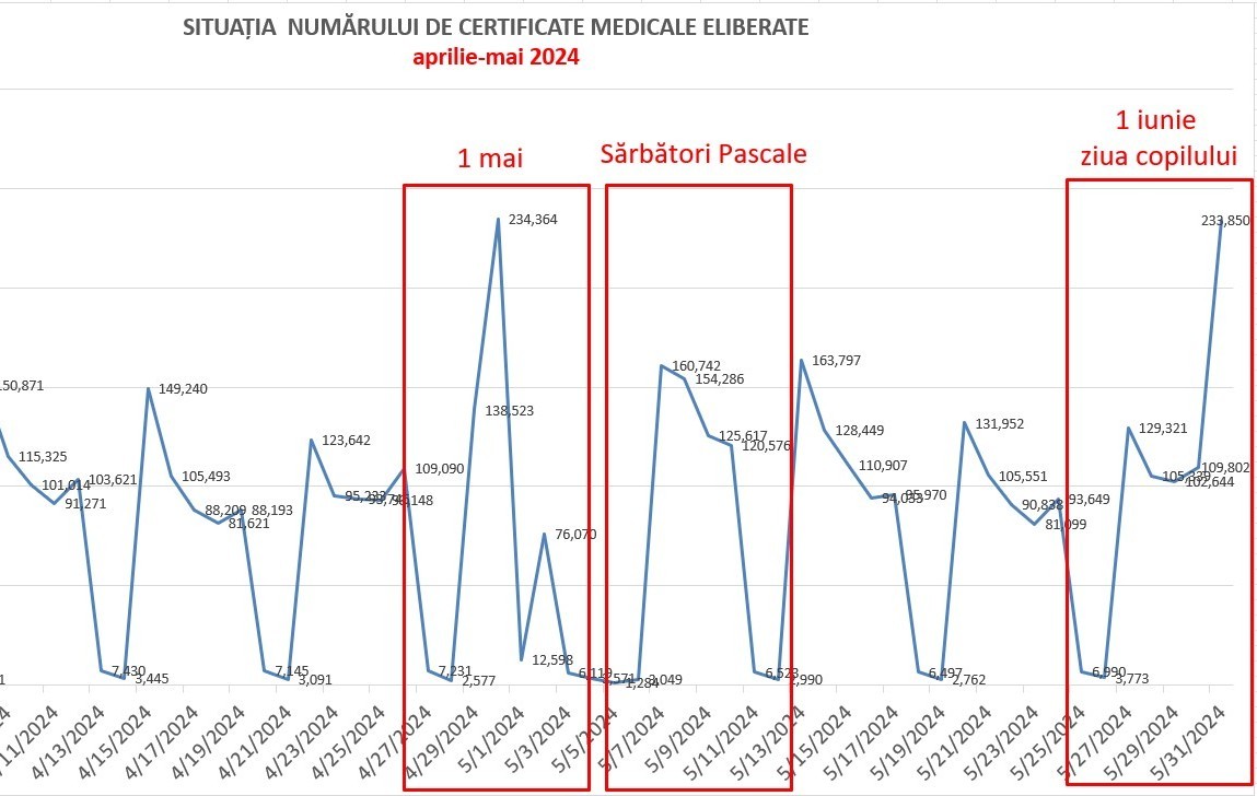 Alexandru Rogobete, ministrul Sănătății, a trimis Corpul de Control al MS și al CNAS în toate județele țării pentru a verifica modul în care se acordă concediile medicale, dând exemplu situația de anul trecut, când, în preajma anumitor sărbători legale, a explodat numărul concediilor medicale! ”O spun clar și ferm: toleranță zero pentru fraudarea concediilor medicale! Am trimis Corpul de Control al Ministerului Sănătății împreună cu Corpul de Control al Casei Naționale de Asigurări de Sănătate în teritoriu pentru o acțiune comună de verificare în detaliu. Nu este normal și este complet imoral ca un sistem întreg să ia din banii dedicați spitalelor, din tratamentele bolnavilor și să finanțeze vacanțele unor angajați care beneficiază nejustificat de concedii medicale fictive. Graficul de mai jos (foto) nu este un EKG. Este o reprezentare grafică a recurenței cu care sute de mii de concedii medicale sunt eliberate, într-un mod suspect, fix în proximitatea zilelor de week-end și a sărbătorilor legale.