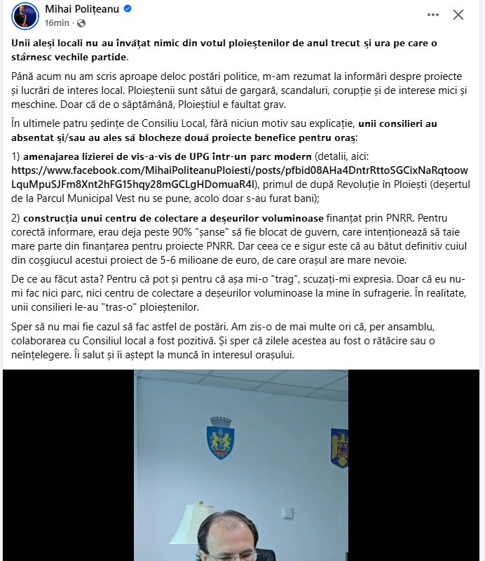 După ce a reușit să divizeze comunitatea prin spectacolele controversate de pe Bulevardul Castanilor, edilul a trecut la un nou nivel: atacuri în mediul online împotriva consilierilor locali care nu dansează după cum le cântă el. Într-o postare pe Facebook (foto jos), Polițeanu acuză că proiectele sale au fost blocate doar ”ca să i-o tragă”, punându-se din nou pe sine în centrul atenției, ca și cum orașul ar exista doar pentru orgoliul lui. Mai grav, primarul susține că, prin votul lor, consilierii ”le-au tras-o ploieștenilor”. O afirmație iresponsabilă, care nu face altceva decât să adâncească prăpastia dintre administrație și cetățeni.