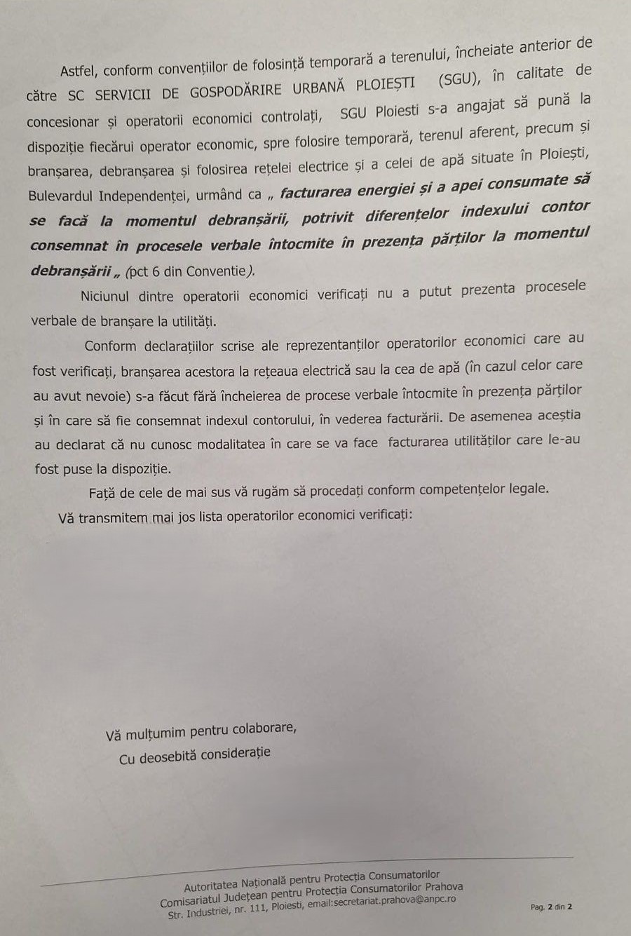 Mai grav decât atât, comisarii de la Protecția Consumatorilor Prahova atrag atenția și asupra unui ”potențial prejudiciu” (semnalat Curții de Conturi) cauzat în urma folosirii de către firmele verificate la data controlului a rețelelor de apă și energie electrică ale Ploieștiului! Deci, până la proba contrară, consumul de apă și curent se face pe banii noștri, ai ploieștenilor!