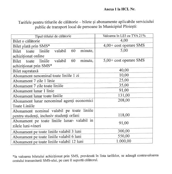 Potrivit unui proiect lansat în dezbatere publică de Primăria Ploiești, joi, 18 septembrie, costul unei călătorii cu mijloacele de transport ale TCE Ploiești ar urma să crească de la 2,5 lei la 4 lei. Sunt mai multe modificări propuse, printre care se află și biletul de călătorie valabil timp de o oră pe toate traseele din municipiul Ploiești, costul acestuia fiind de 5 lei.