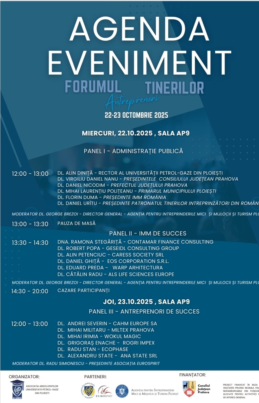 Organizat de Asociația Absolvenților U.P.G., în parteneriat cu Universitatea Petrol-Gaze din Ploiești, Asociația Eurospirit și Agenția pentru Întreprinderile Mici și Mijlocii și Turism Ploiești, proiectul este finanțat de Consiliul Județean Prahova, prin programul de finanțare nerambursabilă a activităților nonprofit de interes județean. Participanții vor descoperi, prin sesiuni interactive, dezbateri și momente de networking, ce înseamnă cu adevărat drumul de la idee la afacere. Forumul Tinerilor Antreprenori propune trei paneluri tematice care conectează mediul universitar, administrația publică și sectorul privat – o rețetă perfectă pentru colaborare, învățare și inovație.