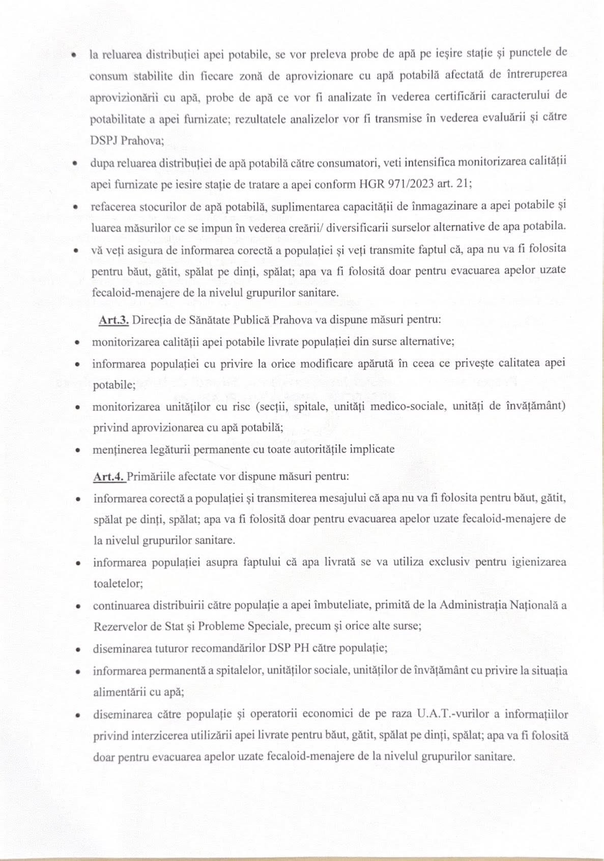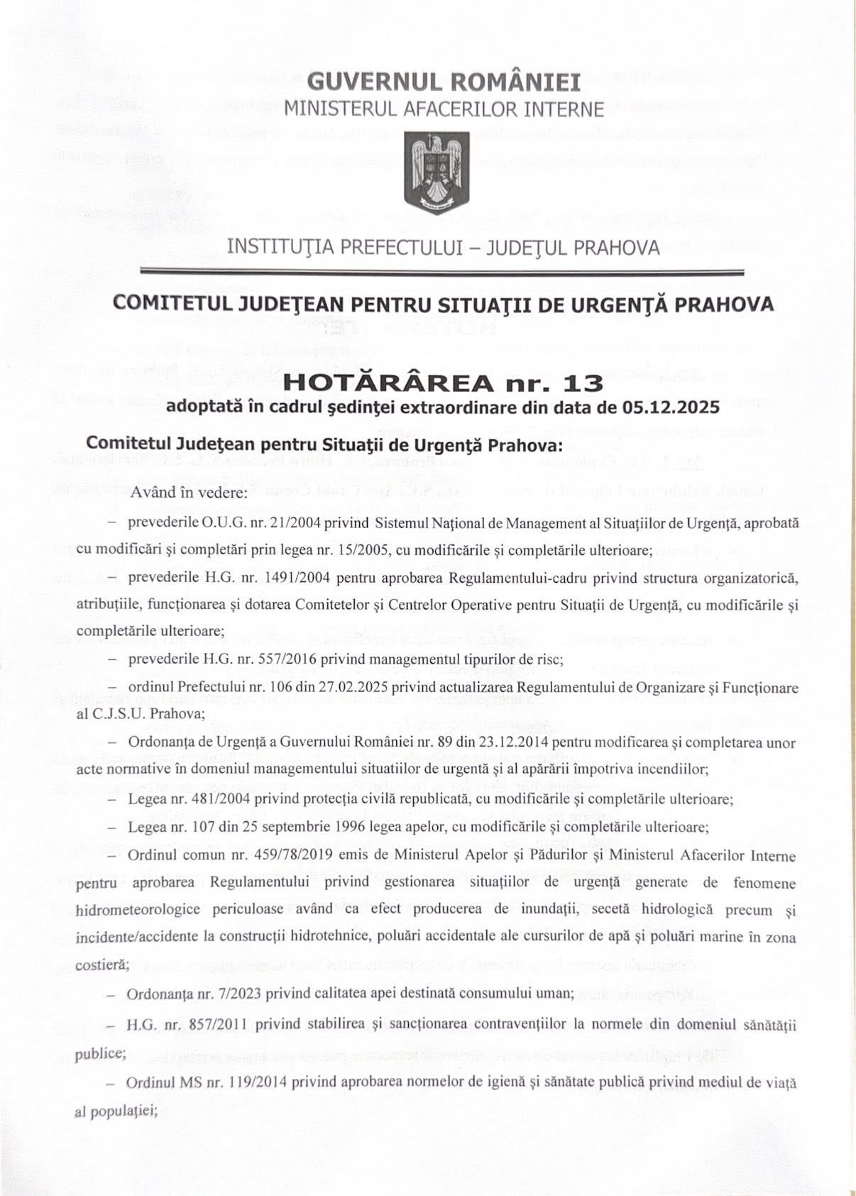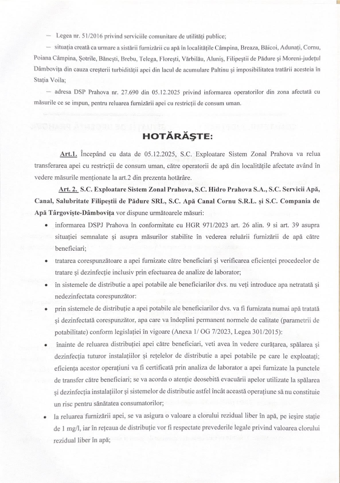 Comitetul Județean pentru Situații de Urgență Prahova a adoptat, vineri seară, Hotărârea nr.13/05.12.2025 privind măsurile care se vor lua pentru începerea furnizării APEI CU RESTRICȚII către localitățile afectate, progresiv, începând cu ora 23:00. Aceasta va fi folosită doar pentru evacuarea apelor uzate fecaloid-menajere de la nivelul grupurilor sanitare! Hotărârea (foto jos) cuprinde o serie de măsuri ce vor fi implementate la nivelul operatorilor de apă, DSP Prahova, ISU Prahova și localităților afectate, informează Instituția Prefectului, care face apel către populație SĂ FOLOSEASCĂ APA FURNIZATĂ DE OPERATOR EXCLUSIV ȘI DOAR PENTRU IGIENIZAREA TOALETELOR!