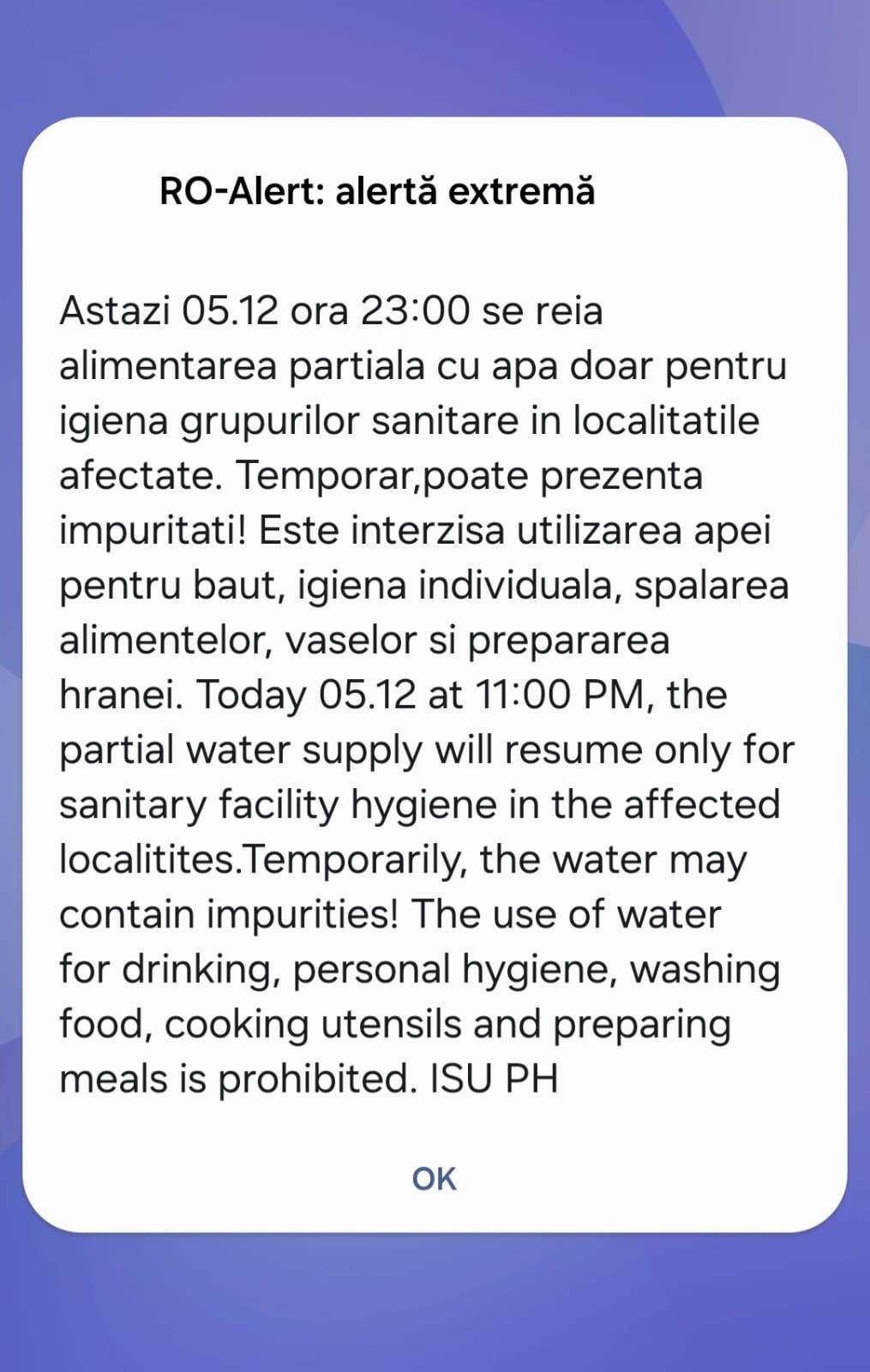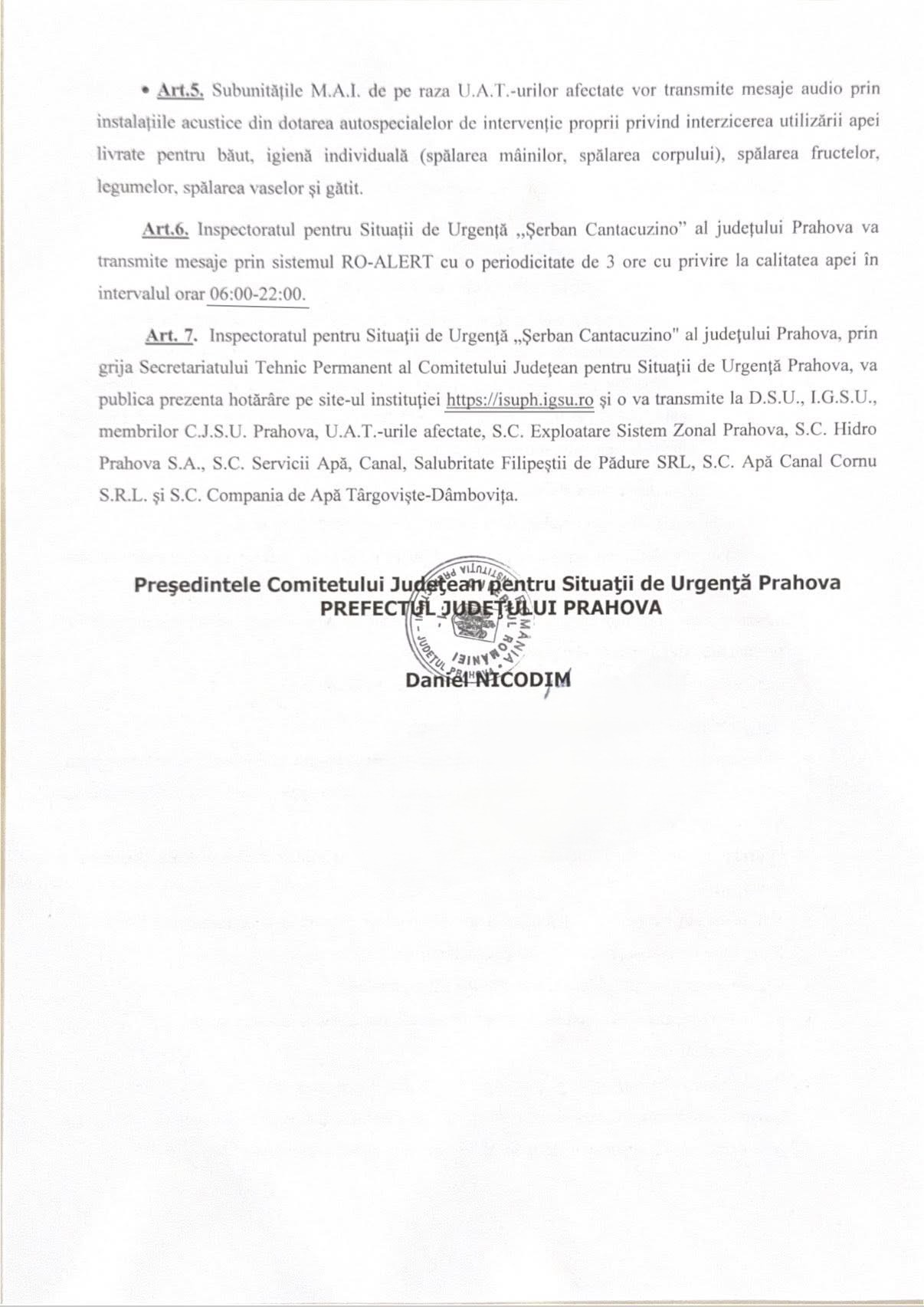 Inspectoratul pentru Situații de Urgență Prahova va transmite mesaje prin sistemul RO-ALERT cu o periodicitate de 3 ore, cu privire la calitatea apei din rețea, în intervalul orar 6 – 22. Deja a fost emis primul mesaj Ro-Alert pentru populația din zonele afectate: