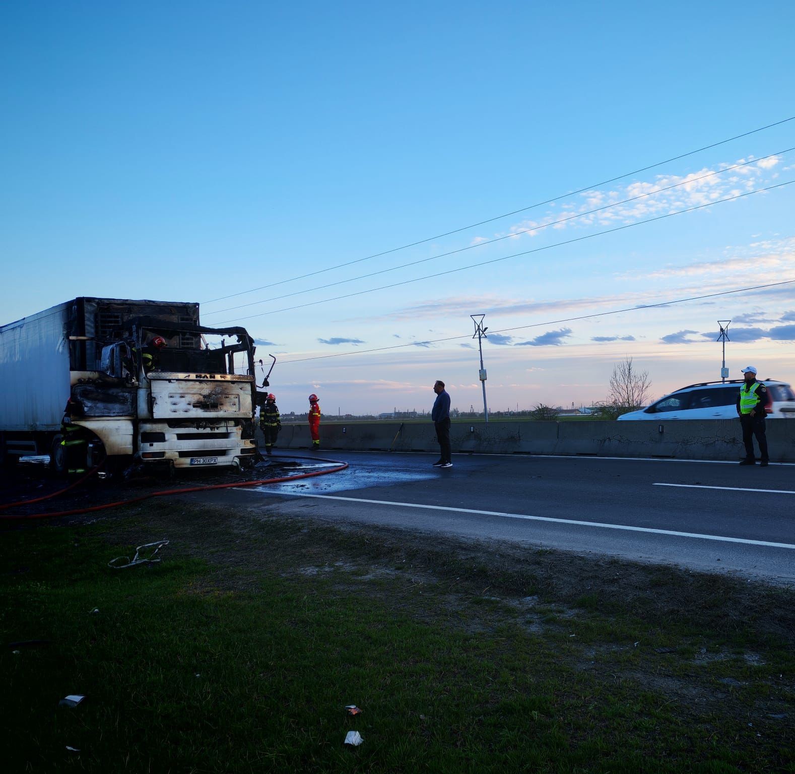 IPJ Prahova: Polițiștii rutieri din cadrul Inspectoratului de Poliție Județean Prahova acționează, la acest moment, pentru fluidizarea și dirijarea traficului rutier pe DN1, în afara localității Băicoi, unde a izbucnit un incendiu la nivelul unui ansamblu de vehicule. Din cauza evenimentului, traficul rutier este blocat pe sensul de mers Ploiești–Brașov, fiind instituite măsuri de deviere și dirijare a circulației pentru prevenirea producerii altor incidente. Polițiștii rutieri sunt prezenți la fața locului și acționează pentru siguranța participanților la trafic, în timp ce echipajele de pompieri intervin pentru stingerea incendiului. Recomandăm conducătorilor auto să manifeste prudență sporită, să respecte indicațiile polițiștilor rutieri și să utilizeze rute alternative, în măsura posibilităților. Traficul va fi reluat în condiții normale după finalizarea intervenției și îndepărtarea autotrenului de pe partea carosabilă. (foto jos: IPJ Prahova)