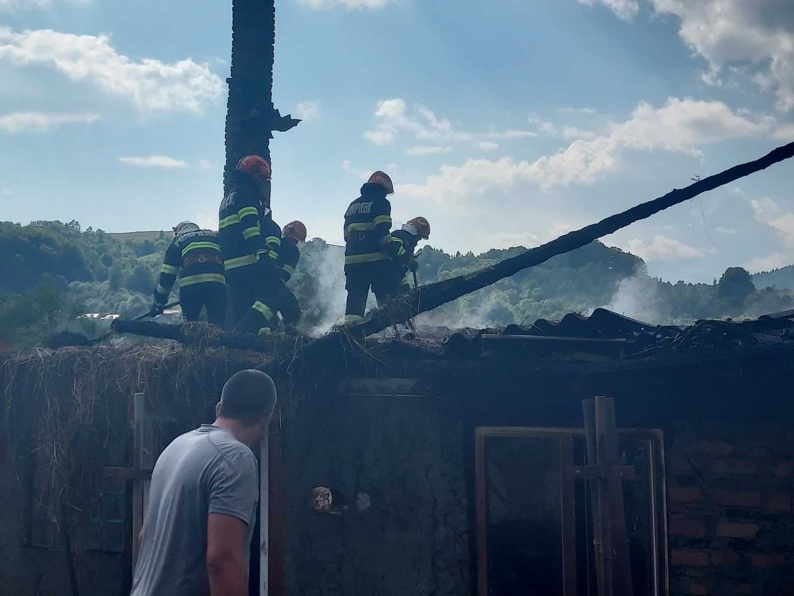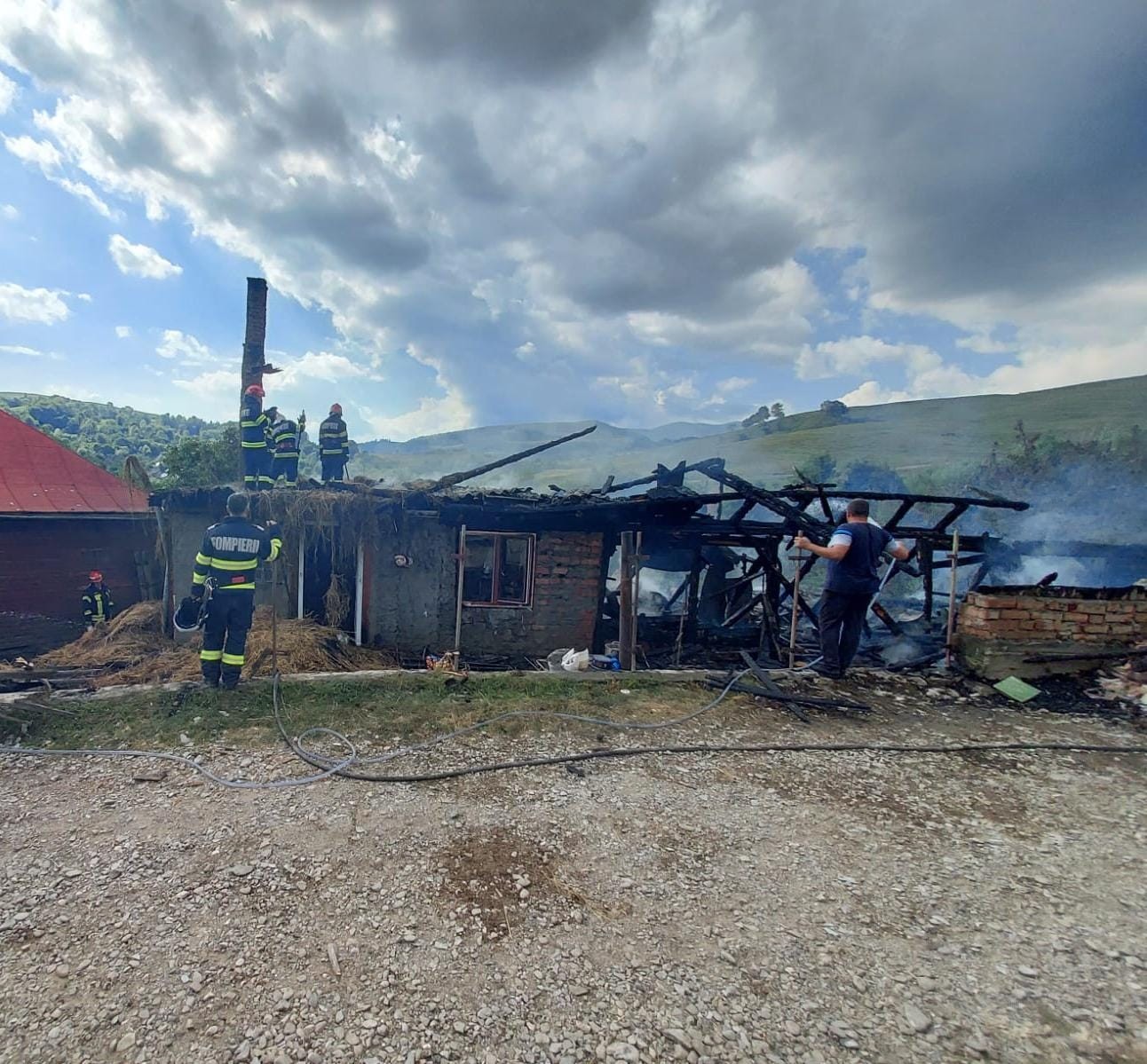 Pompierii militari din cadrul Detașamentului de Pompieri Sinaia au intervenit, vineri după-amiază, pentru localizarea și lichidarea unui incendiu produs într-o gospodărie din comuna Secăria, unde s-au deplasat patru autospeciale de stingere și un echipaj SMURD. La sosirea pompierilor, flăcările se manifestau generalizat la nivelul unui grajd, pe o suprafață de aproximativ 150 mp, existând riscul de a se propaga la o locuință. "Pompierii au depus eforturi pentru localizarea incendiului și împiedicarea propagării acestuia la vecinătăți. Din păcate, în incendiu au ars animalele adăpostite în acel loc, 3 porci, un vițel și în jur de 30 de păsări. De asemenea, o femeie a suferit atac de panică si fost asistată de către echipajul SMURD, însă a refuzat transportul la spital. Cauza probabilă de incendiu: scurtcircuit electric", a transmis ISU Prahova. (sursa foto ISU Prahova)
