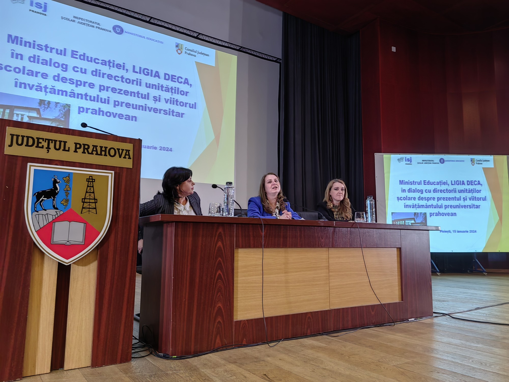 Ligia Deca, ministrul Educației, se află luni, 15 ianuarie, în județul Prahova. După vizite în teritoriu, la Nucșoara, în comuna Posești, și la Sinaia, unde s-a inaugurat noua clădire a Școlii "George Enescu", Ligia Deca este față în față cu directorii unităților de învățământ din Prahova. Întâlnirea are loc la Sala Europa a Palatului Administrativ din Ploiești. Printre subiectele abordate au fost proiectele finanțate prin PNRR, dar și transportul gratuit al elevilor navetiști. Ligia Deca a aflat abia în sala de ședință că în județul Prahova au fost încheiate, cel puțin parțial, contracte cu operatorii de transport, iar elevii pot beneficia de abonamente gratuite de transport spre și dinspre școală. Vom reveni.