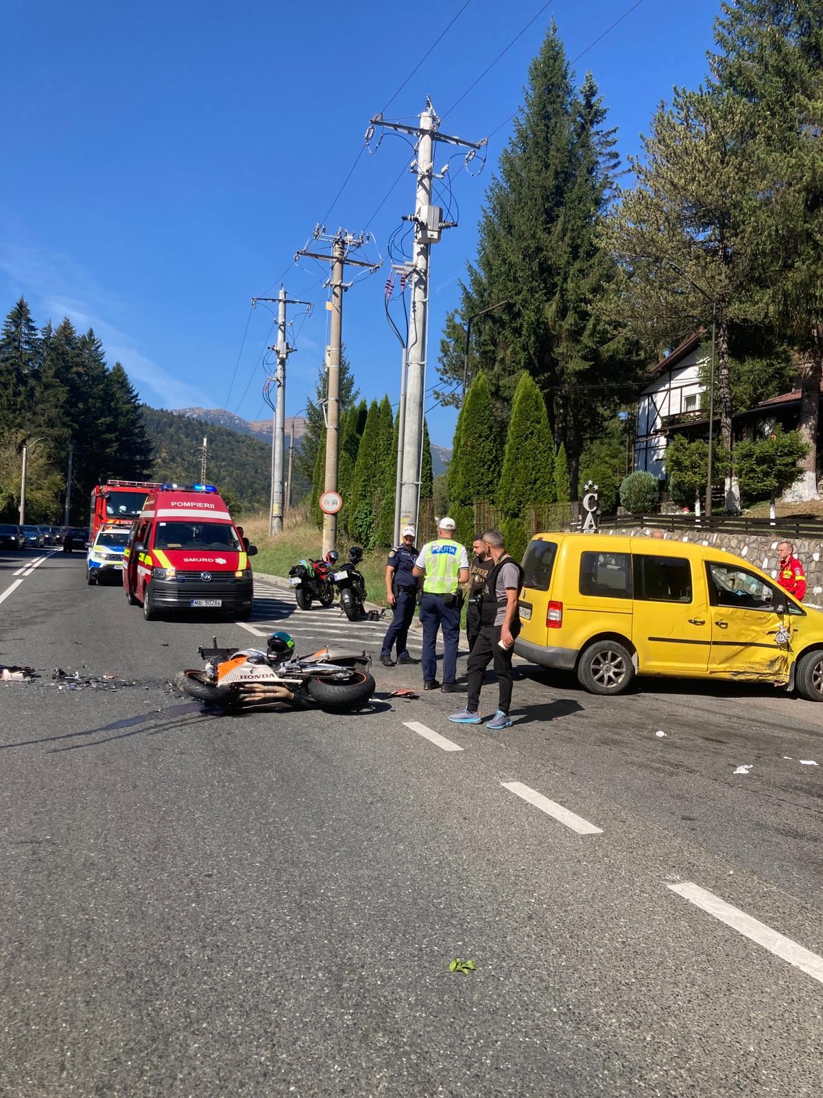 Accident grav pe DN1, zona Izvorul Rece - Sinaia. A fost solicitat elicopterul SMURD pentru a prelua un motociclist rănit grav