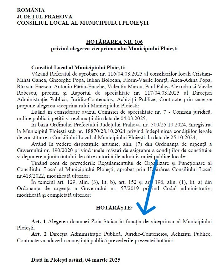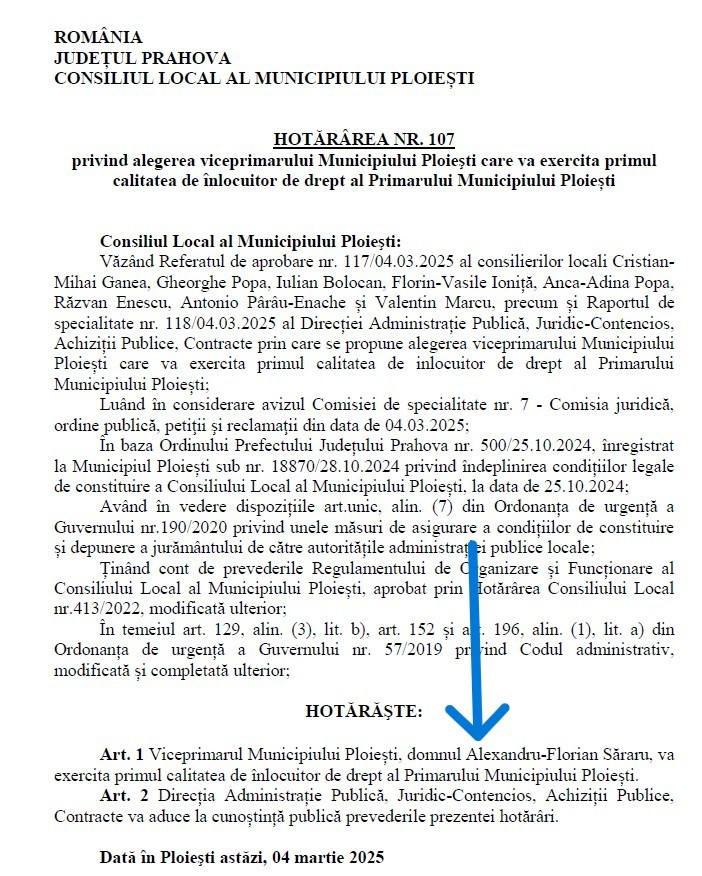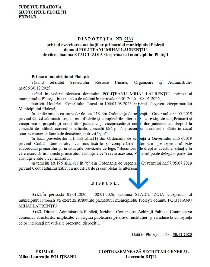 Prin intermediul unui comunicat de presă, Alexandru Săraru arată că Hotărârea Consiliului Local nr. 107 din 4 martie 2025 stabilește clar că, în perioadele de absență legală ale primarului, acesta este primul înlocuitor de drept al edilului. Cu toate acestea, primarul ar fi emis Dispoziția nr. 9133 din 30 decembrie 2025 (n.n. - document nepublicat pe site-ul oficial al Primăriei Ploiești) prin care a delegat atribuțiile sale celuilalt viceprimar, Zoia Staicu, pentru perioada 5–8 ianuarie 2026, când edilul șef s-a aflat în concediu.