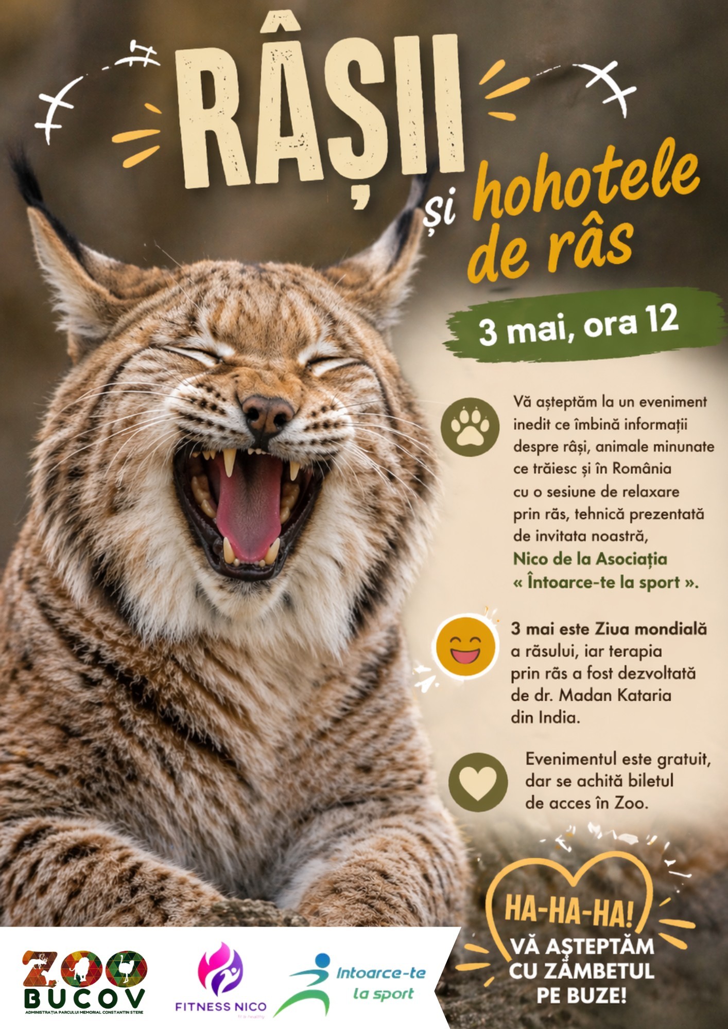 Pe de altă parte, duminică, 3 mai, Grădina Zoologică de la Bucov va găzdui un eveniment destinat vizitatorilor de toate vârstele, cu ocazia Zilei Mondiale a Râsului. Astfel, duminică, de la ora 12:00, la Zoo Bucov, un eveniment care combină informații despre râși cu o sesiune de terapie/relaxare prin râs. Invitat special: Nico de la Asociația „Întoarce-te la sport”.