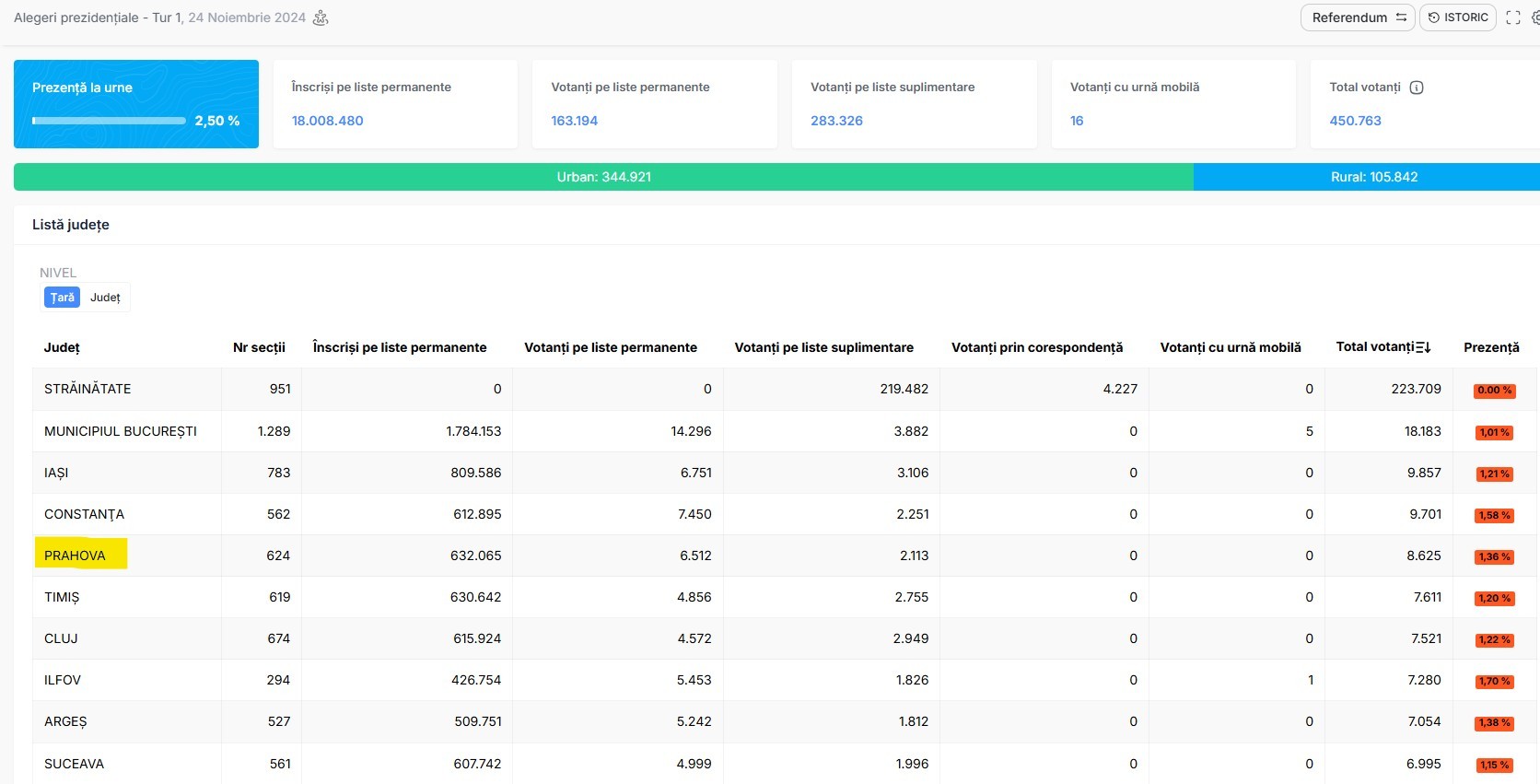 Județul Prahova se situează pe locul 4 în țară la număr de votanți, după prima oră de la deschiderea secțiilor de votare, potrivit datelor oficiale publicate de Autoritatea Electorală Permanentă. Circa 9.000 de alegători (1,44%) își exprimaseră deja opțiunea în secții din județul Prahova, din care aproximativ 2000 - pe liste suplimentare.
