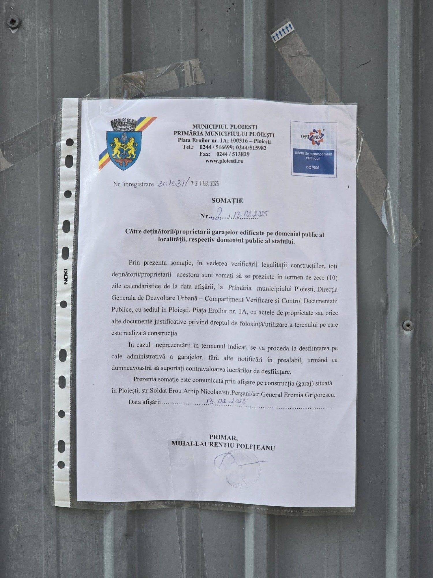 Echipa Primăriei Ploiești a fost pe teren pentru notificarea tuturor garajelor de pe Strada Arhip Nicolae (zona de vest), au anunțat reprezentanții municipalității. ”Această acțiune face parte din angajamentul ferm al primarului Mihai Polițeanu de a face ordine în oraș și de a reda spațiul public comunității. Echipa mixtă formată din angajați ai Primăriei și Poliției Locale au marcat 157 de garaje și au informat deținătorii despre obligația de a prezenta, în termen de 10 zile, actele care atestă dreptul de proprietate sau de folosință”, se specifică într-o informare a Primăriei Ploiești. Astfel, în termen de 10 zile, deținătorii pot prezenta documentele justificative, iar garajele fără acte legale vor primi somații pentru desființare și aducere la starea inițială, în locul acestora urmând să se amenajeze parcări sau spații verzi. Reprezentanții Primăriei Ploiești anunță că deținătorii garajelor sunt obligați să se prezinte la Primăria Ploiești (Piața Eroilor nr. 1A, Direcția Generală de Dezvoltare Urbană – Compartiment Verificare și Control Documentații Publice) cu actele de proprietate sau alte documente justificative. În caz de neprezentare în termen de 10 zile, garajele vor fi desființate pe cale administrativă, pe cheltuiala deținătorilor.