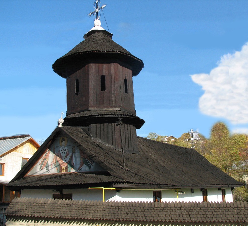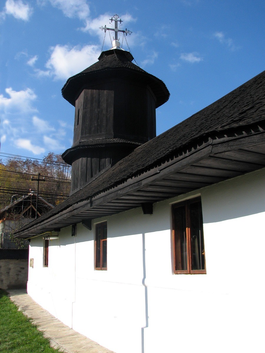 Amplasată pe cea mai veche cale de acces din localitate, chiar pe drumul oilor, biserica a fost construită din bârne de lemn tencuite, în stil țărănesc românesc-ardelenesc, cu navă centrală, fiind acoperită cu șindrilă. Se pare că marele cutremur din 1838 a distrus acest așezământ bisericesc. Biserica actuală, a cărei vechime nu se cunoaște, este din lemn, dar este tencuită și poartă hramul “Sfântul Spiridon”. Ea a fost ridicată pe fundațiile bisericii anterioare. Aceasta include actualul naos și altar și e o construcție tipică din lemn, de pe Valea Teleajenului, cu structura pereților din bârne orizontale din stejar, cioplite manual și ornamentate în coadă de rândunică. Turnul clopotniță situat pe pridvor are structură din bârne din lemn, grinzile fiind îmbinate cu cuie din lemn și cuie metalice forjate manual.