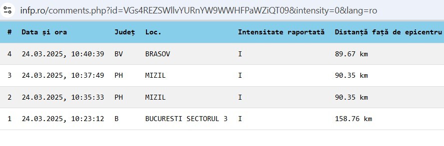 Institutul Naţional de Cercetare - Dezvoltare pentru Fizica Pământului INCDFP transmite că luni dimineață, la ora 10:14:35 (ora locală a României), s-a produs în Zona Seismică Vrancea, în județul Vrancea, un cutremur mediu cu magnitudinea ml 4.0, la adâncimea de 140.0 km. Cutremurul s-a produs în apropierea următoarelor oraşe: 37km V de Focșani, 72km N de Buzău, 72km E de Sfântu-Gheorghe, 87km S de Bacău, 87km E de Brașov, 88km SV de Bârlad. Este un cutremur de intensitate medie, care se pare că s-ar fi simțit și la Mizil, conform mărturiilor publicate pe site-ul oficial al INFP.