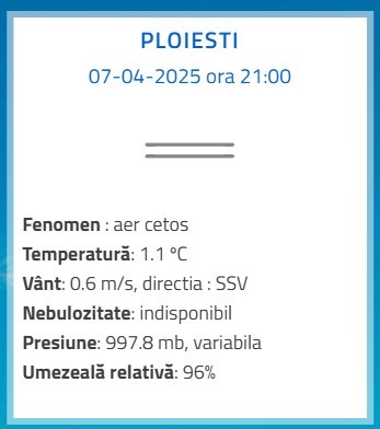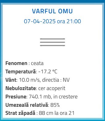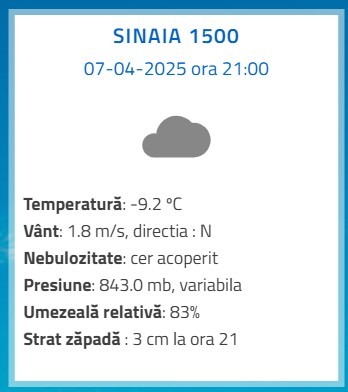 Luni, 7 aprilie 2025. În Prahova, la ora 21.00, se înregistrau temperaturi ca în miezul iernii adevărate, la multe stații meteorologice din județ. De departe, la Vârful Omu, era cel mai frig. Aproape de minus 18 grade, iar la stația meteo de la cota 1500 din Sinaia erau minus 9 grade. Nici în cele două municipii ale Prahovei nu era prea confortabilă temperatura de afară, la Ploiești fiind 1,1 grade Celsius, iar la Câmpina doar 1,2 grade Celsius. Se anunță o noapte cu temperaturi scăzute, care vor coborî cu siguranță sub limita înghețului și în zona de șes a Prahovei.