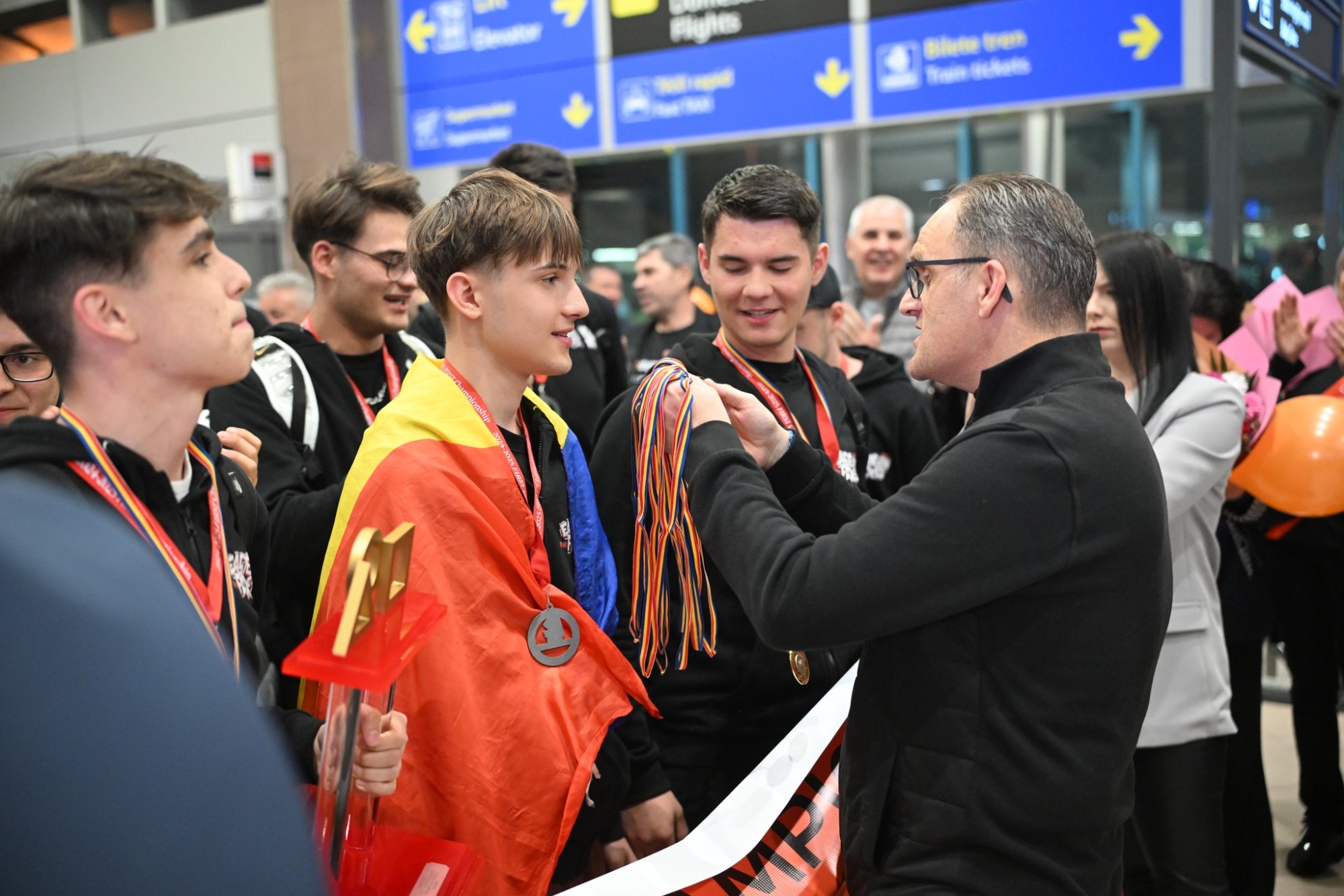 Președintele Consiliului Județean Prahova, Virgiliu Daniel Nanu, și prefectul Emil Drăgănescu au fost prezenți pentru a-i felicita personal, oferindu-le medalii simbolice ca semn de apreciere pentru performanțele lor internaționale. Atmosfera din aeroport a fost animată de aplauze, baloane, flori și stegulețe, într-un cadru informal în care emoția părinților și entuziasmul tinerilor s-au împletit firesc.