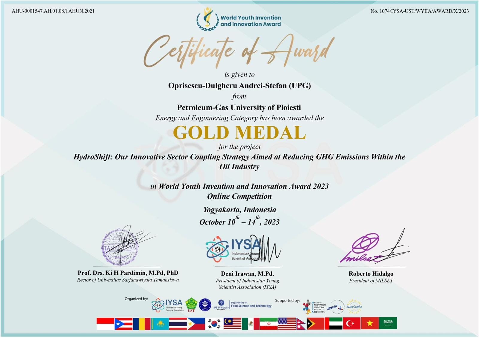Un tânăr din comuna Bucov, fiul fostei campioane mondiale la săritura în lungime, Mirela Dulgheru, a obținut aurul mondial pentru un proiect inovator! Anunțul a fost făcut de Primăria Bucov, care a anunțat întreaga comunitate despre rezultatul de excepție al lui Andrei Ștefan Oprișescu Dulgheru. ”Aur mondial pentru inovație, pentru un student din comuna Bucov! Un vis care poate schimba lumea. Nu este SF, ci este povestea reală a lui Andrei Ștefan Oprișescu Dulgheru (23 de ani), un viitor absolvent al UPG Ploiești, locuitor al comunei Bucov! Ideea fiului fostei campioane mondiale la săritura în lungime – Mirela Dulgheru (care dă și numele sălii de sport din Bucov) a uimit o lume întreagă și a învins proiectele principalilor contracandidați, din SUA și Coreea de Sud la „World Youth Invention and Innovation Award”, din Indonezia! Cu ce a impresionat Andrei? Cu o idee care transformă apele murdare din rafinării în… energie curată! HydroShift – așa se numește proiectul care i-a adus medalia de aur. Andrei Ștefan Oprișescu Dulgheru face acum parte din campania „100 de tineri pentru dezvoltarea României” și arată lumii întregi că DA, se poate și din România să pornească idei care pot schimba lumea! Merită să-i dăm un share și să-i acordăm un mare BRAVO! Tinerii ca el merită să fie cunoscuți, susținuți și…urmăriți cu admirație! Andrei a demonstrat că nimic nu este imposibil și că, dacă îți dorești cu adevărat să realizezi ceva, nimic nu te poate opri din drumul către succes! FELICITĂRI!!”, este mesajul reprezentanților comunității din Bucov.