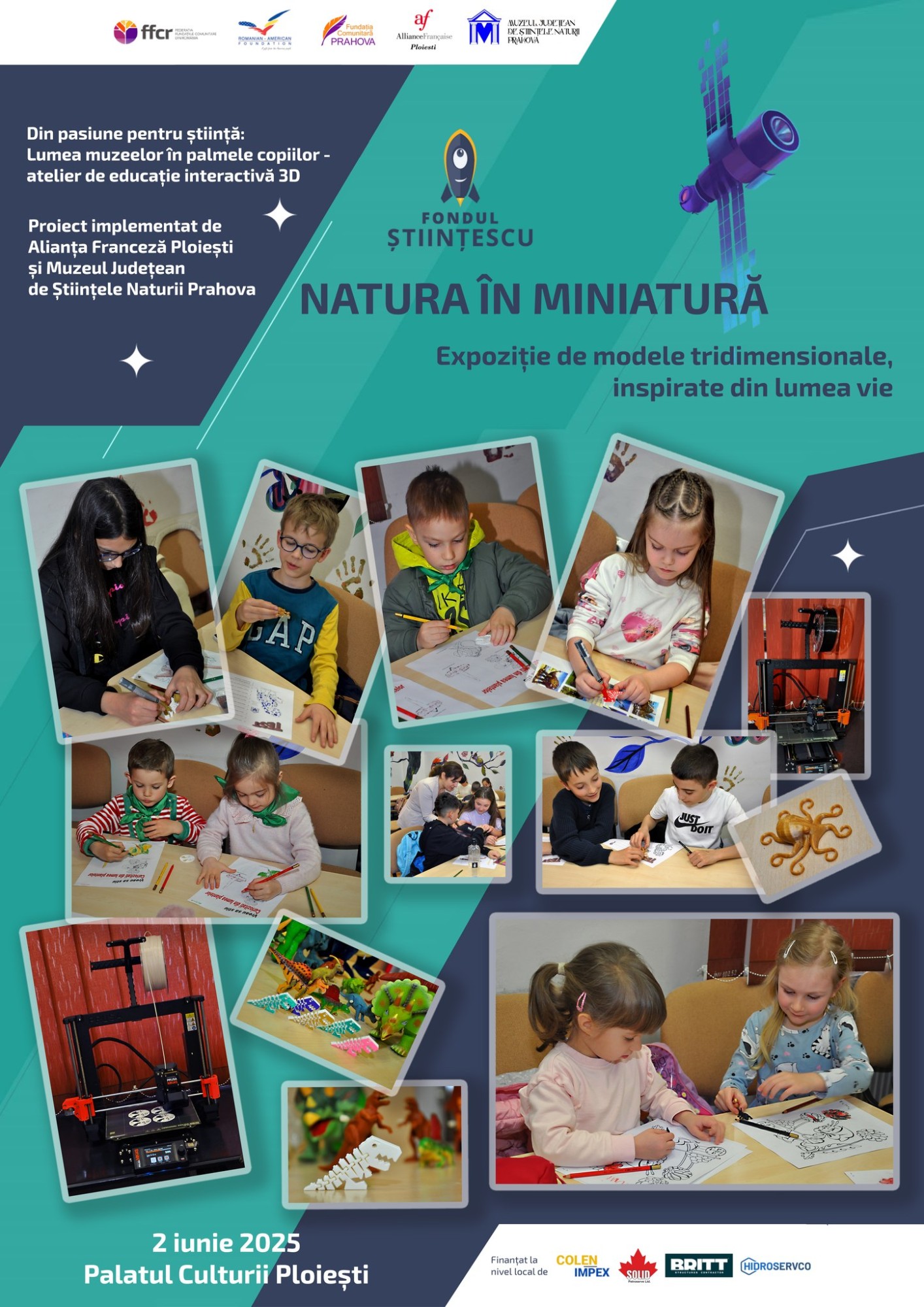 Pe 2 iunie 2025, la ora 11:00, Muzeul Județean de Științele Naturii Prahova, în parteneriat cu Alianța Franceză Ploiești, vă invită în Rotonda Palatului Culturii la vernisajul expoziției „Natura în miniatură – modele tridimensionale inspirate din lumea vie”. Expoziția face parte din proiectul educațional „Lumea muzeelor în palmele copiilor”, finanțat de Fundația Comunitară Prahova prin fondul Științescu, și aduce împreună patrimoniul natural, noile tehnologii și creativitatea elevilor. Publicul va putea admira replici 3D ale unor piese de patrimoniu natural și cultural, dar și modele originale create de copii în cadrul atelierelor interactive desfășurate la muzeu. Proiectul încurajează educația interdisciplinară, promovând muzeul ca spațiu de învățare modernă și colaborativă.