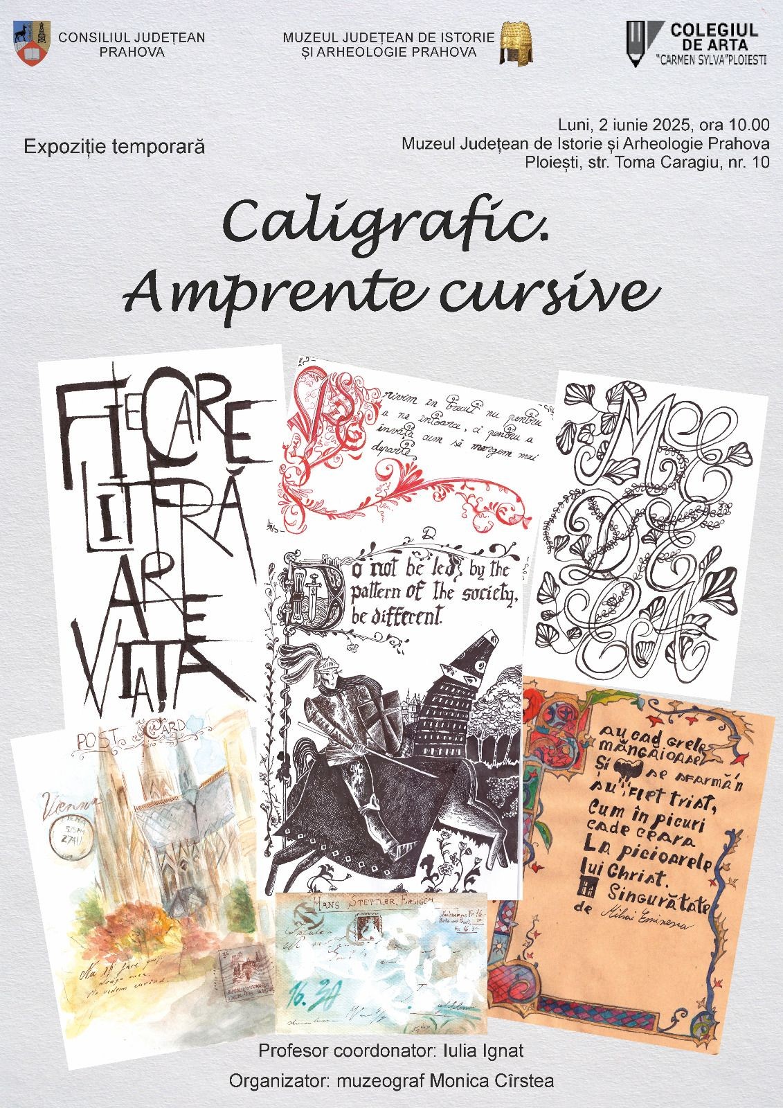 Tot pe 2 iunie, începând cu ora 10:00, Muzeul Județean de Istorie și Arheologie Prahova vă așteaptă la sediul din Ploiești, str. Toma Caragiu nr. 10, la vernisajul expoziției „Caligrafic. Amprente cursive”. Dedicată redescoperirii caligrafiei — arta scrisului frumos de mână — într-o eră digitală care tinde să o lase în uitare, expoziția este rezultatul unui parteneriat între muzeu și Colegiul de Artă „Carmen Sylva” din Ploiești. Sub coordonarea profesoarei Iulia Ignat, elevii claselor a IX-a C și a XI-a B au realizat cărți poștale și caiete de caligrafie, îmbinând scrisul de mână cu arta plastică, într-un demers artistic care cultivă răbdarea, precizia și sensibilitatea estetică.
