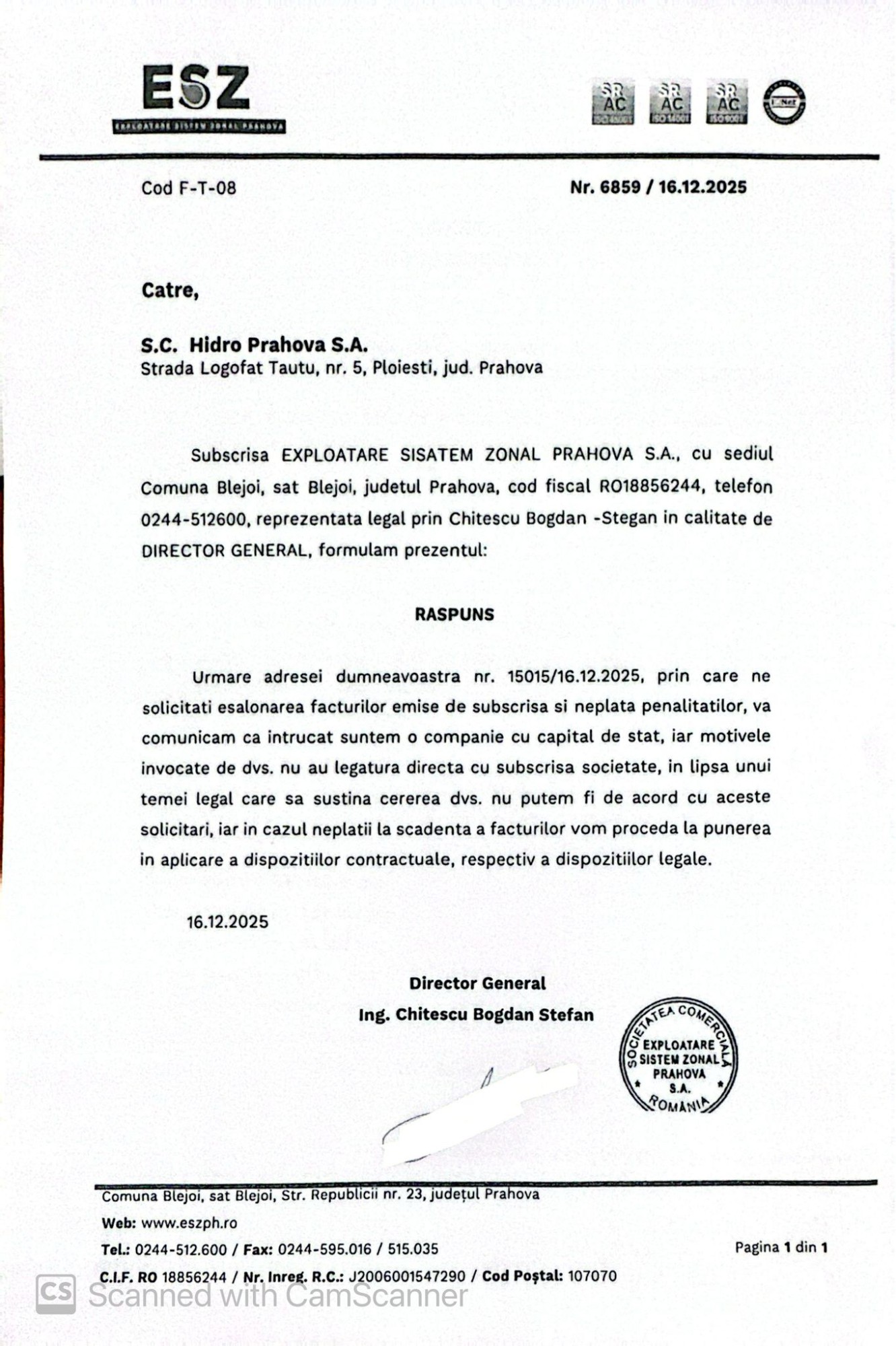 ”Cu toate eforturile pe care le-am făcut, ieri am avut un șoc”, a declarat în cadrul conferinței de presă Andrei Bontic, directorul Hidro Prahova. Acesta a precizat că a primit de la cei care ”sunt parte a problemei (n.n. – ESZ) și din partea cărora ne așteptam la solidaritate și la o mână de ajutor întinsă populației” două adrese – una prin care anunță că măresc prețurile cu 10%, de la 1 ianuarie 2026 și alta – un răspuns negativ la solicitarea Hidro Prahova de a achita eșalonat factura către ESZ Prahova!