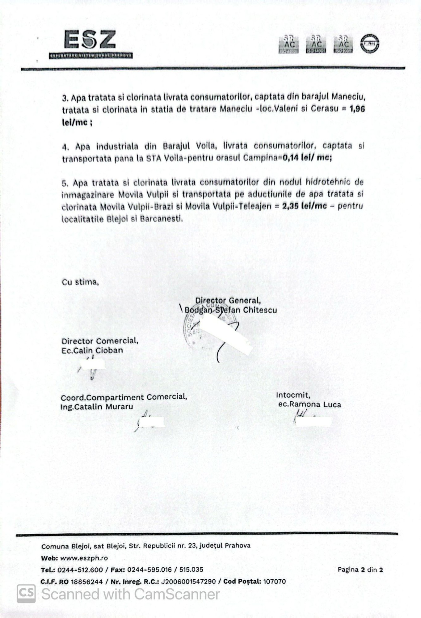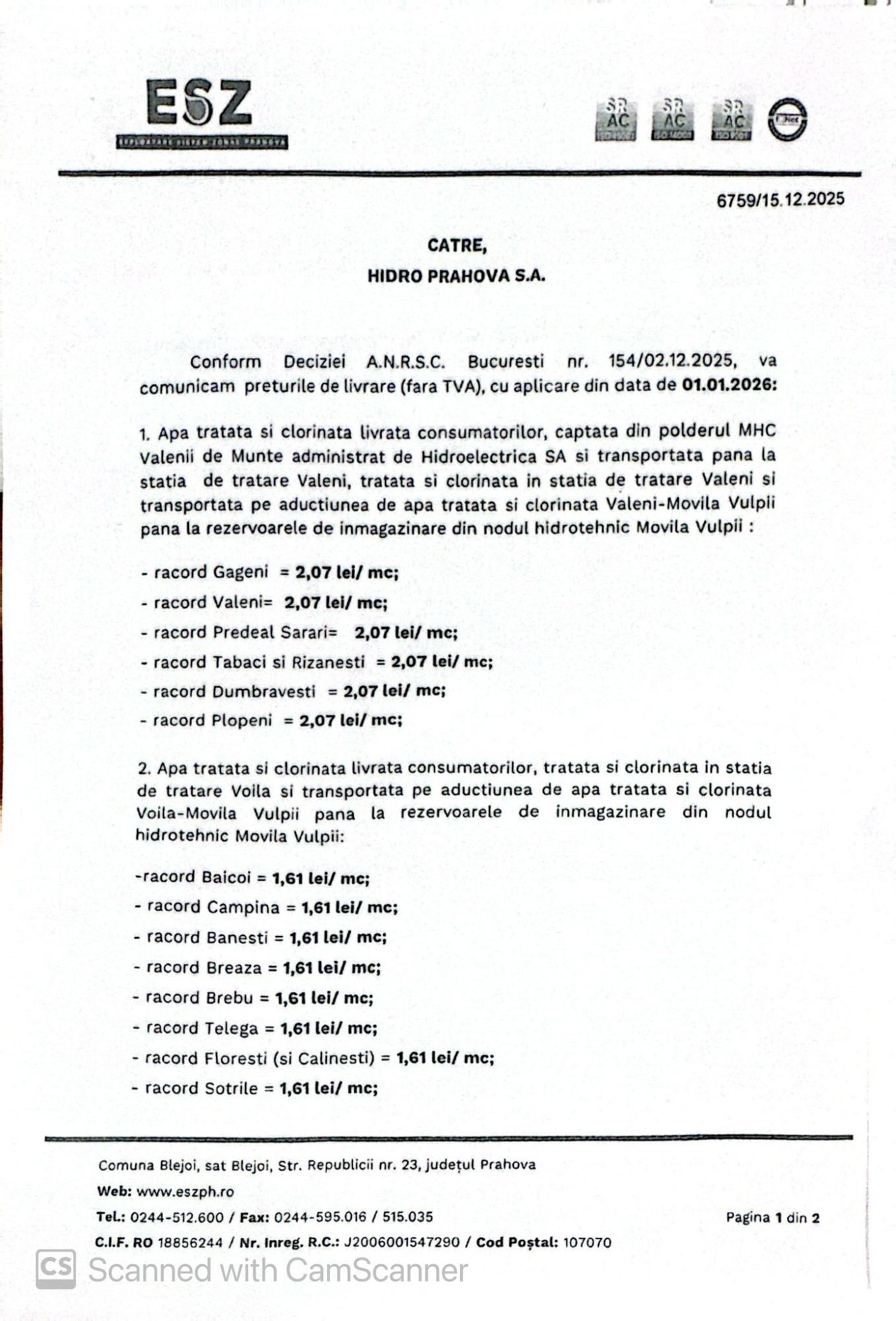 Președintele CJ Prahova, Virgil Nanu, a menționat, pe de altă parte, că populația trebuie să știe toate aceste lucruri. ”Întreaga conducere a ESZ trebuie să reevalueze această adresă și să nu aplice nicio creștere de tarif. Ține strict de ei. Noi am trecut printr-o criză și ei fac parte din această criză. Din acest motiv le cer acest lucru. Să nu invoce hârtia de la ANRSC. Hidro Prahova a cerut o eșalonare a plăților și rog conducerea ESZ să reevalueze toate acestea și să fie alături de noi și de cetățeni”.