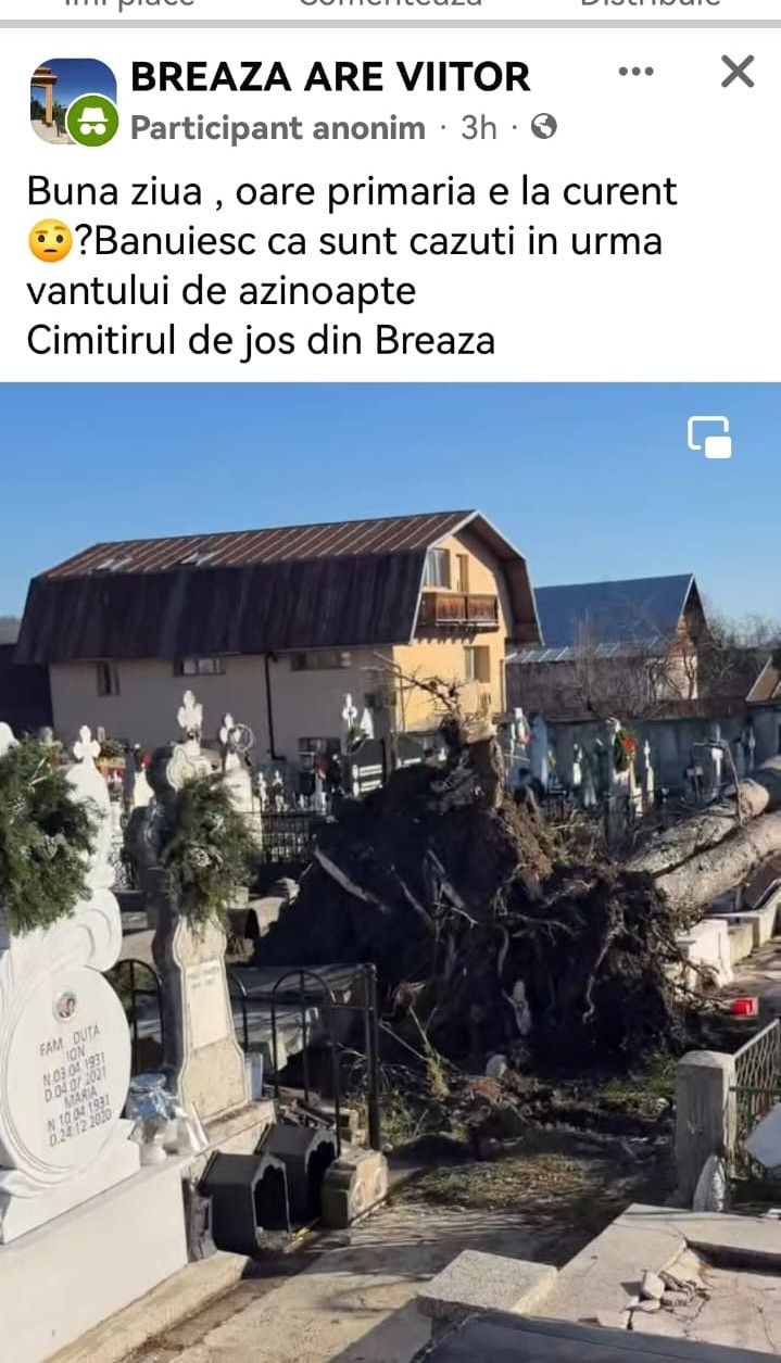 Mai multe morminte din cimitirul Breaza de Jos au fost grav avariate după ce, în noaptea de duminică spre luni, vântul puternic a doborât mai mulți brazi de mari dimensiuni. Copacii dezrădăcinați au căzut direct peste locurile de veci, provocând distrugeri mari – cruci rupte, monumente smulse din fundații și morminte afectate.