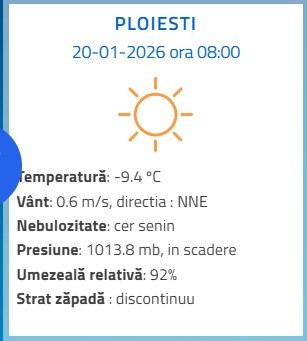La ora 08:00, în Câmpina s-au înregistrat minus 10,5 grade Celsius, iar la Ploiești minus 9,4 grade. În același timp, la Sinaia, la cota 1500, termometrele au indicat minus 5,9 grade, iar la Vârful Omu minus 6,6 grade Celsius.