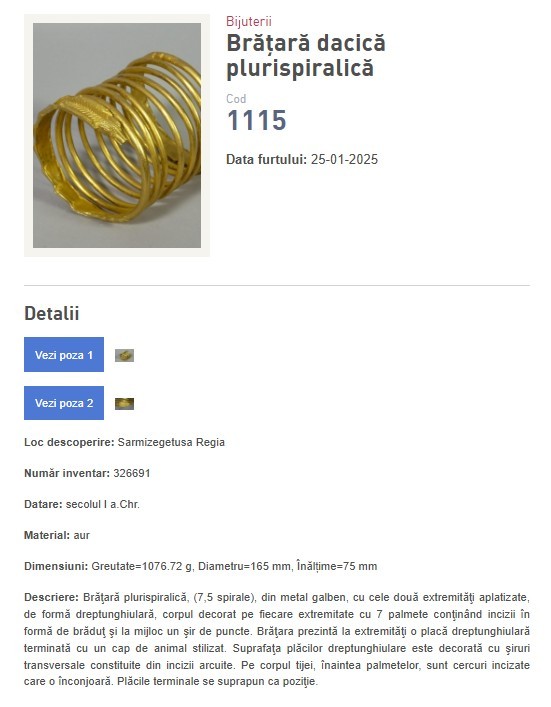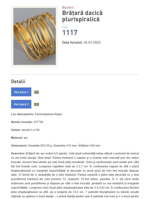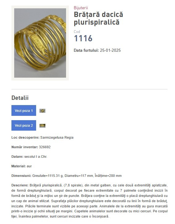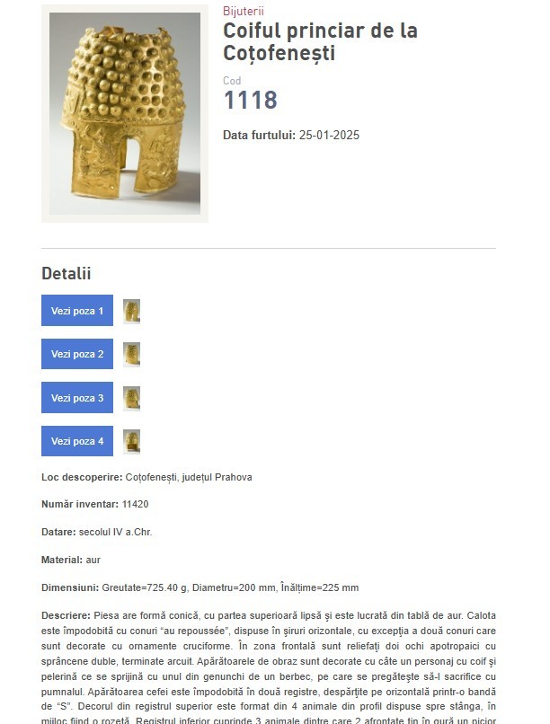 Deși autoritățile din România și cele din Țările de Jos au anunțat recuperarea coifului de la Coțofenești și a două dintre cele trei brățări dacice furate în ianuarie 2025 din Muzeul Drents din Țările de Jos, toate aceste piese de patrimoniu figurează în continuare pe site-ul oficial al Poliției Române, la categoria „Obiecte furate”. Lista include descrieri extrem de detaliate ale fiecărui obiect, inclusiv caracteristici tehnice, elemente decorative și chiar defectele existente înainte de furt. Aceste informații oferă o imagine completă asupra valorii istorice și artistice a pieselor, dar și asupra stării lor de conservare.