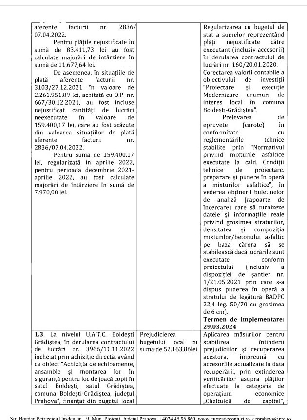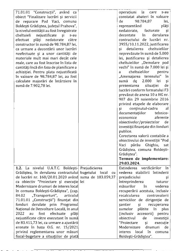 - Proiectare și execuție modernizare drumuri de interes local (finanțat prin PNDL), în anul 2022 s-au efectuat plăți nejustificate către executantul lucrărilor, în sumă de 83.411 lei, ”ca urmare a ajustării eronate în baza OG nr. 15/2021 privind reglementarea unor măsuri fiscal-bugetare a situațiilor de plată aferente facturii nr. 2836/07.04.2022”, valoare crescută cu majorările de întârziere de 11.677 de lei.