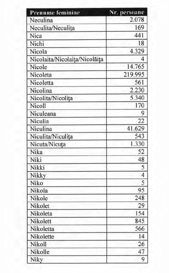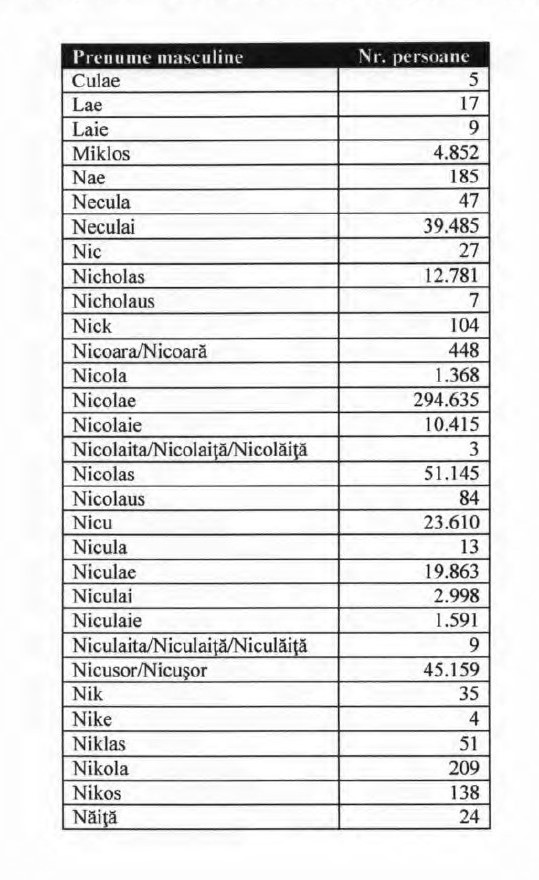 Deși cei ce poartă numele Nicoleta și Nicolae sunt cei mai mulți dintre sărbătoriții zilei de mâine, de Sf. Nicolae, sunt și români care poartă derivate mai extravagante din numele celui mai darnic dintre sfinți. Așadar, potrivit Direcției Generale pentru Evidența Persoanelor, patru români poartă numele Nike, cinci se numesc Culae, 17 - Lae, nouă - Laie, altele putând fi lecturate în imaginile de mai jos.
