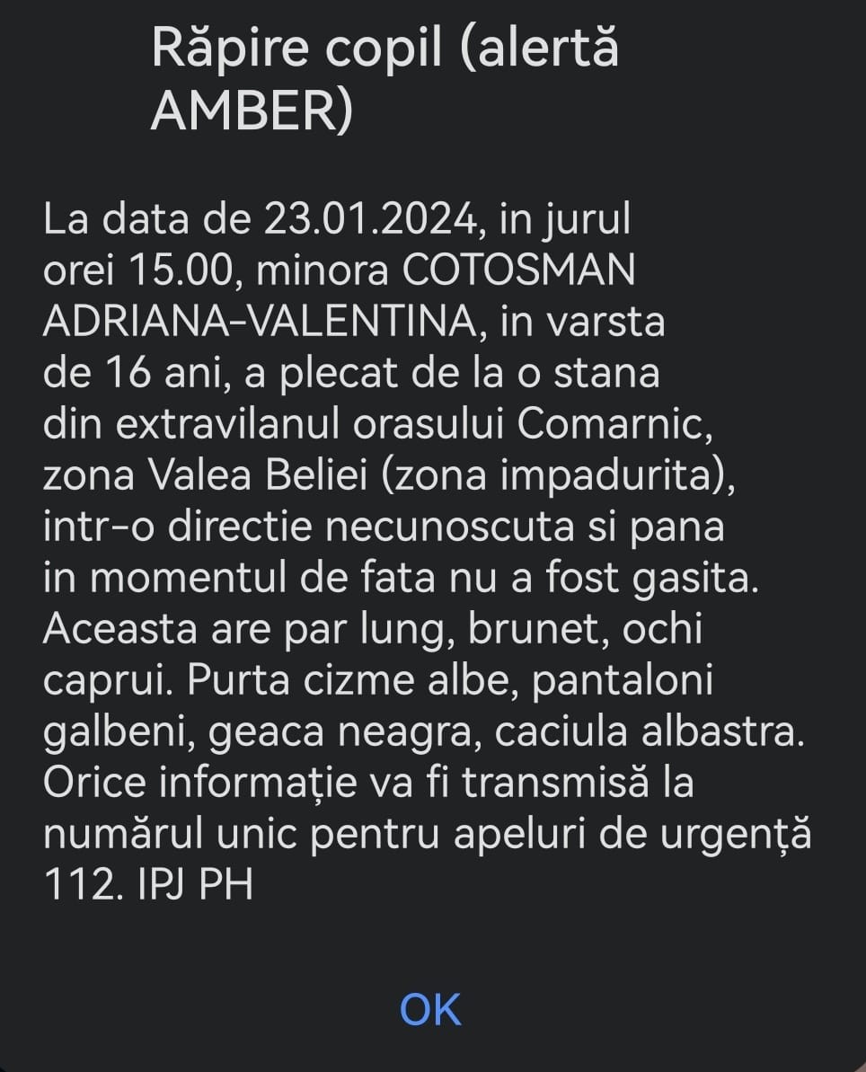 Adriana Valentina Cotoșman, o copilă în vârstă de 16 ani, din orașul Comarnic, a dispărut fără urmă, marți după-amiază, după ce a plecat de la o stână din afara localității, printr-o zonă împădurită. Azi-noapte, în zona Comarnic a fost un ger năprasnic, iar echipele plecate în căutarea adolescentei nu au găsit-o nici până la orele dimineții. Locuitorii din Comarnic au primit și o Alertă răpire copil (foto jos), care a pus pe jar întreaga comunitate, însă se pare că nu există altă categorie la care RoAlert să poată încadra plecarea adolescentei. Anunțul oficial al Poliției Române: ”La data de 23.01.2024, in jurul orei 15.00, minora Cotoșman Adriana-Valentina, în vârsta de 16 ani, a plecat de la o stână din extravilanul orașului Comarnic, zona Valea Beliei (zonă împădurită), într-o direcție necunoscută și până în momentul de față nu a mai revenit. Îmbrăcăminte: cizme albe, pantaloni galbeni, geacă neagră, fes albastru. Semnalmente: brunetă, ochi căprui, par lung”. Cine știe ceva despre copilă sau dacă a văzut-o cineva, poate suna la 112 să furnizeze informații despre ea.