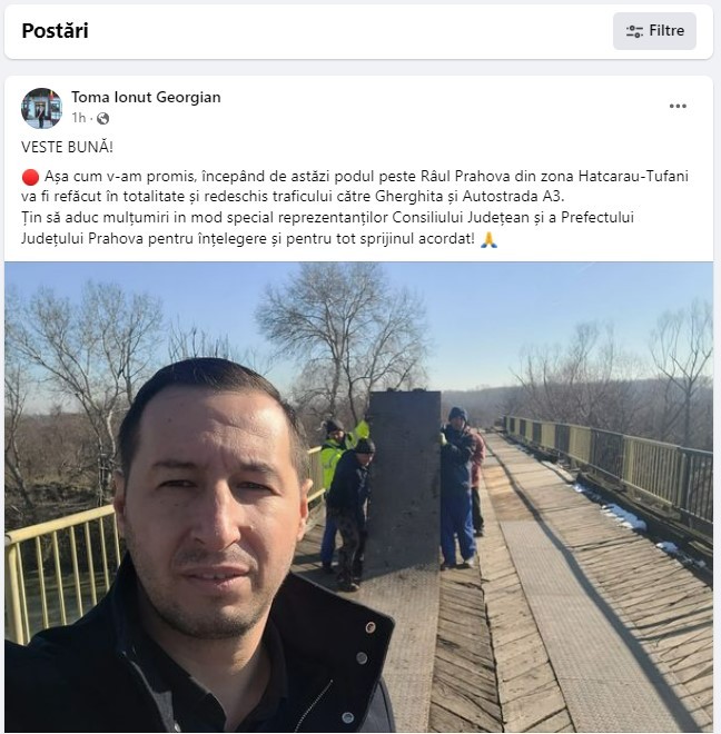 Probabil una dintre cele mai șubrede structuri existente pe drumurile județene din Prahova - podul peste râul Prahova, care face legătura între comunele Drăgănești și Gherghița, pe DJ 147 - a intrat în reparații de urgență. Anunțul a fost făcut chiar de către primarul comunei Drăgănești, Ionuț Georgian Toma, care a prezentat pe pagina sa de Facebook imagini cu muncitorii veniți să dezasambleze lemnăria putredă a podului, care va fi înlocuită, temporar, cu traverse mult mai rezistente decât scândurile existente până acum. Potrivit declarațiilor primarului Toma, se estimează că lucrările de înlocuire a suprastructurii din lemn vor dura cel puțin o lună, iar după încheierea acestor lucrări va fi reluată circulația rutieră, întreruptă la finalul anului trecut din cauza problemelor majore de siguranță a traficului. Podul din lemn face legătura, așa cum am precizat, între comunele Gherghița și Drăgănești, dar este foarte important pentru oamenii din întreaga zonă, dat fiind că pe aici se poate ajunge la autostrada A3 București-Ploiești. Deocamdată, trebuie rezolvată problema actuală, însă există promisiuni de la Consiliul Județean Prahova că podul ar urma să intre pe o listă de investiții, fie pentru ca structura actuală să fie modernizată, fie ca acest pod să fie construit de la zero.