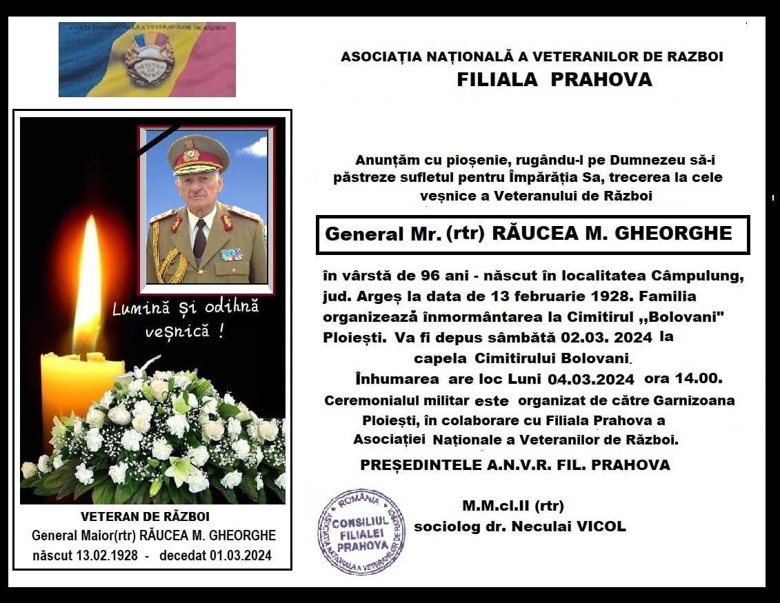 Generalul maior Gheorghe Răucea, veteran de război și fost președinte al Asociației Veteranilor de Război Prahova, a plecat, ieri, în lumea celor drepți, să se alăture foștilor combatanți din cel de-Al Doilea Război Mondial, care au luptat pentru țara lor! Generalul Răucea s-a stins din viață pe data de 1 Martie, la vârsta de 96 de ani. Garnizoana Ploiești va organiza un ceremonial militar la înmormântarea care va avea loc luni, 4 martie, la Cimitirul Bolovani din Ploiești, la ora 14.00. Corpul neînsuflețit a fost depus la Capela Cimitirului Bolovani, începând de astăzi, 2 martie. Nicolae Vicol, președintele Asociației Naționale a Veteranilor de Război - Filiala Prahova, a postat, astăzi, o scurtă înregistrare video cu generalul Răucea. Dumnezeu să-l odihnească în pace!