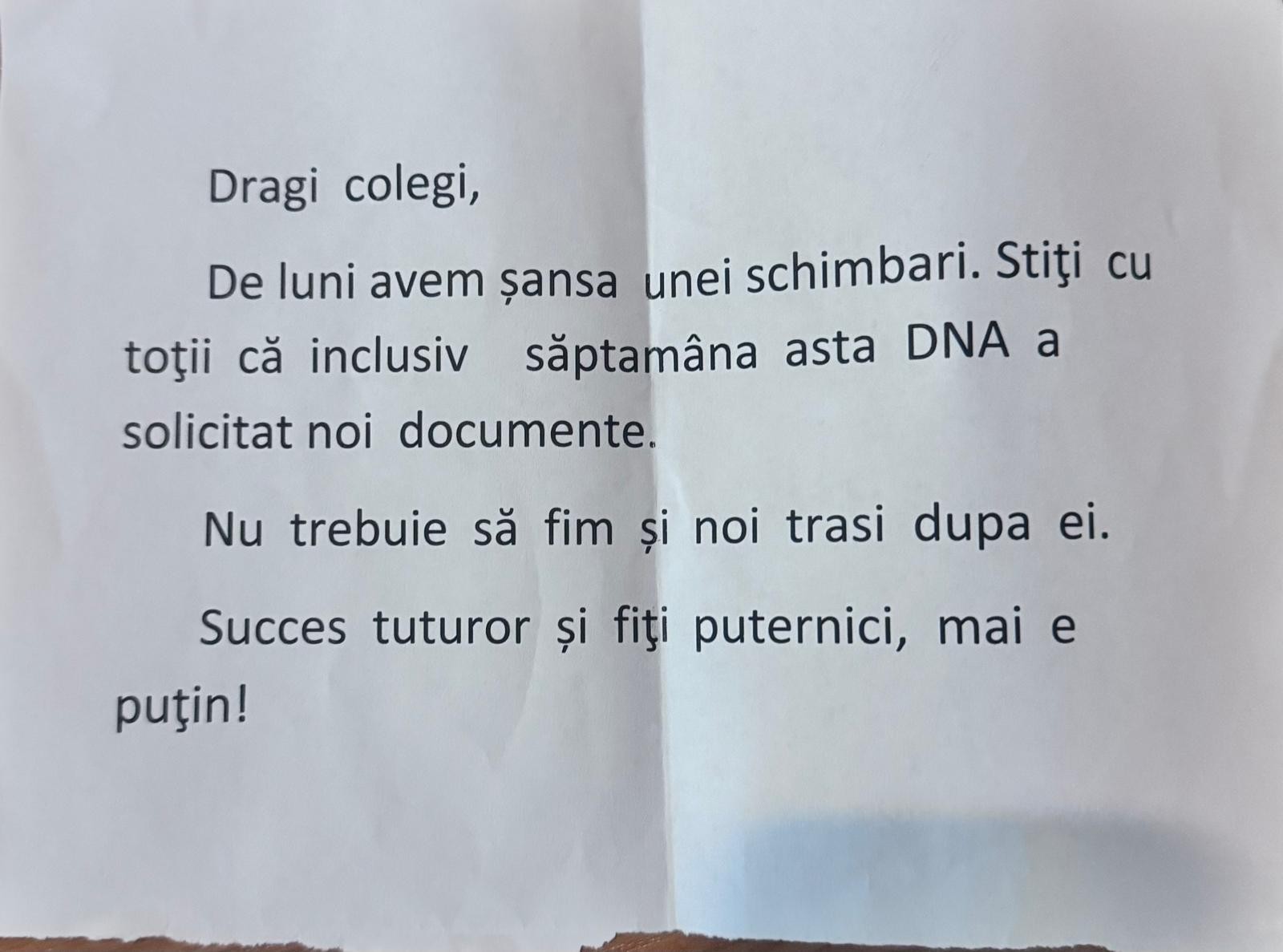 ”Dragi colegi, de luni avem șansa unei schimbări. Știți cu toții că inclusiv săptămâna asta DNA a solicitat noi documente. Nu trebuie să fim și noi trași după ei. Succes tuturor și fiți puternici, mai e puțin!” - este mesajul tipărit la imprimantă găsit pe ușile birourilor de toți angajații Consiliului Județean Prahova care s-au prezentat la serviciu vineri dimineață, pe 7 iunie.