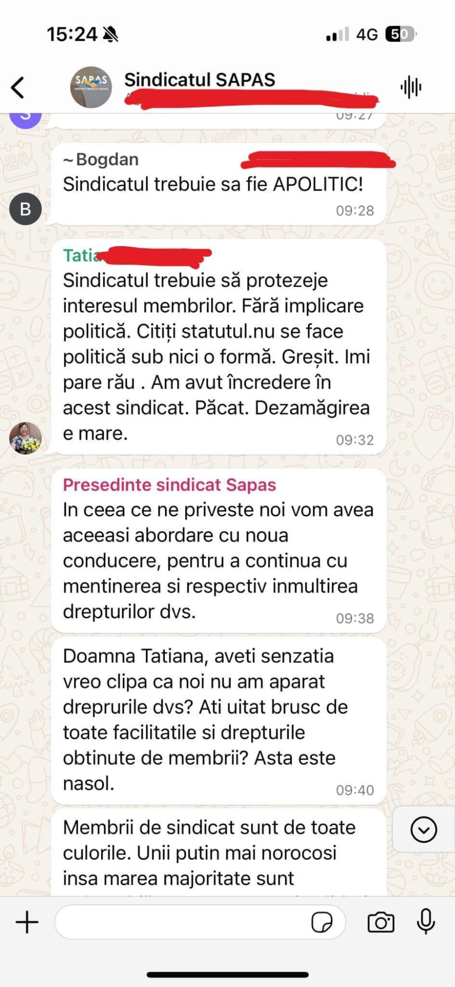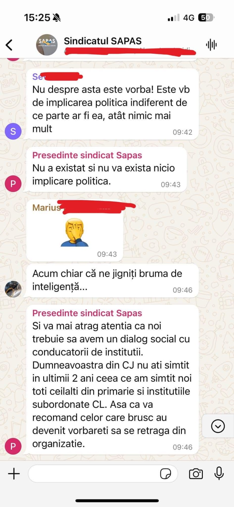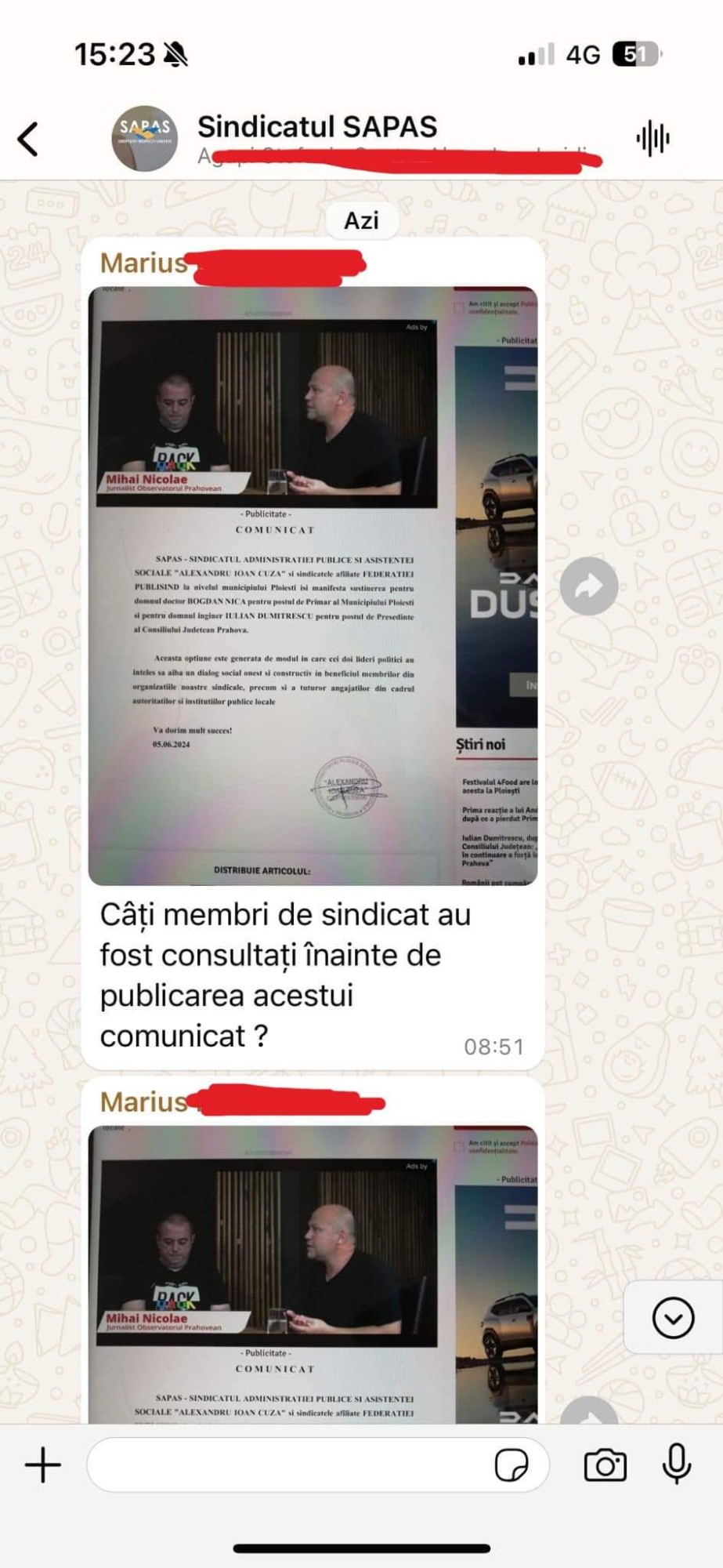Mesaje dintre conducerea SAPAS și membrii de sindicat au fost publicate, marți, 11 iunie, de către consilierul județean social democrat Bogdan Furtună, care îl acuză de presiune politică și manipulare pe președintele acestui sindicat, Radu Florian Constantin: ”𝐏𝐫𝐞ș𝐞𝐝𝐢𝐧𝐭𝐞𝐥𝐞 𝐒𝐀𝐏𝐀𝐒 - 𝐑𝐚𝐝𝐮 𝐅𝐥𝐨𝐫𝐢𝐚𝐧 𝐂𝐨𝐧𝐬𝐭𝐚𝐧𝐭𝐢𝐧 - 𝐮𝐧 𝐦𝐨𝐝𝐞𝐥 𝐝𝐞 𝐩𝐫𝐞𝐬𝐢𝐮𝐧𝐞 𝐩𝐨𝐥𝐢𝐭𝐢𝐜ă ș𝐢 𝐦𝐚𝐧𝐢𝐩𝐮𝐥𝐚𝐫𝐞! SAPAS - Sindicatul Administrației Publice și Asistenței Sociale “Alexandru Ioan Cuza” și sindicatele afiliate Federației Publisind din Municipiul Ploiești, sub conducerea domnului Radu Florian Constantin, a încălcat statutul sindicatului (https://sapas.ro/docs/statut.pdf) prin susținerea politică a candidaților PNL la Primăria Municipiului Ploiești și la președinția Consiliului Județean Prahova. Când mai mulți membri ai sindicatului și-au exprimat indignarea pentru că nu au fost consultați înainte de luarea acestei decizii și și-au manifestat nemulțumirea, li s-a cerut să părăsească organizația. Atunci când l-am cunoscut pe domnul Radu Florian Constantin, am fost impresionat de intențiile sale aparent bune și de imaginea sa de corectitudine, principialitate și demnitate. Acum, sunt profund dezamăgit de această manifestare grosolană de neprofesionalism și de trădarea flagrantă a valorilor pe care pretindea că le susține. În calitate de consilier județean, consider această abordare a președintelui SAPAS ca fiind total neprofesionistă și solicit demisia sa de onoare, dacă un astfel de gest mai are relevanță în zilele noastre”.