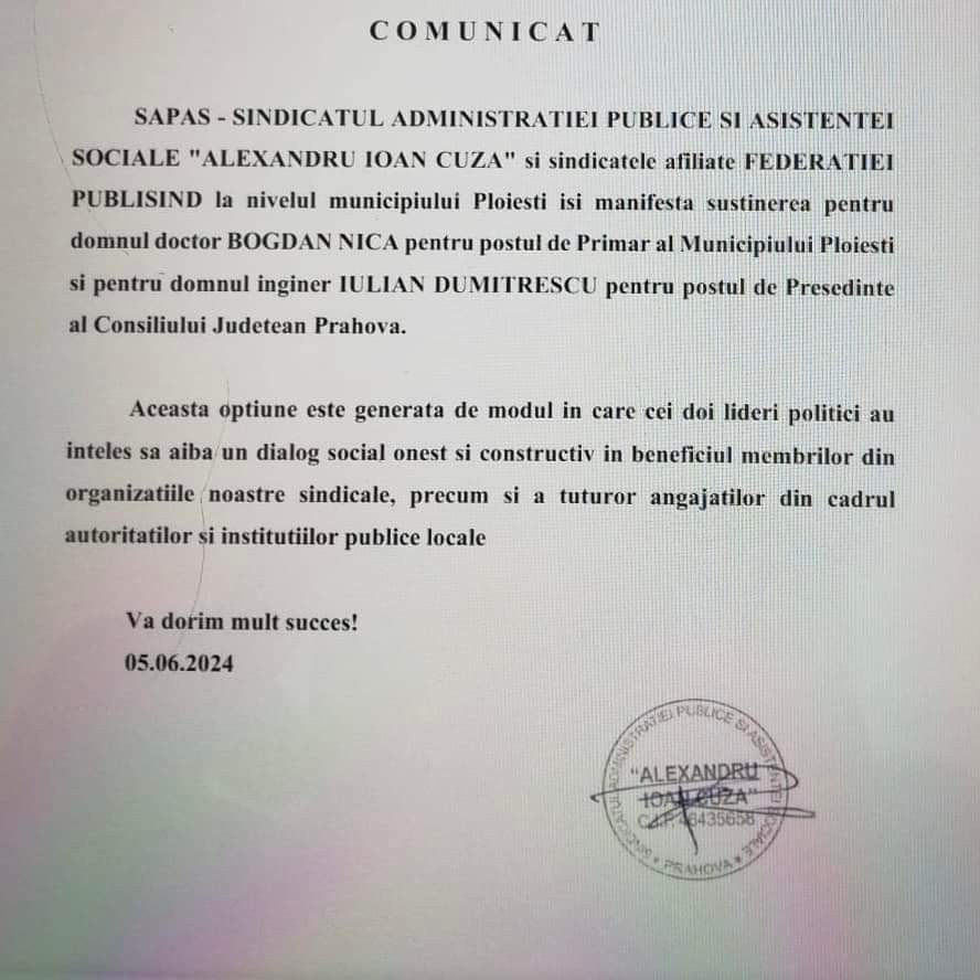 Un scandal de proporții s-a iscat într-un sindicat din administrația publică din Prahova, după mesajul de susținere, fără consultarea membrilor de sindicat, pentru candidații PNL Iulian Dumitrescu și Bogdan Nica, publicat chiar înainte de alegerile locale din 9 iunie! După apariția în spațiul public a unui comunicat de presă al SAPAS - Sindicatul Administrației Publice și Asistenței Sociale “Alexandru Ioan Cuza” și sindicatele afiliate Federației Publisind din Municipiul Ploiești, în care, sub semnătura președintelui acestui sindicat, se promitea susținere pentru candidații PNL la Primăria Ploiești și la președinția Consiliului Județean Prahova, respectiv pentru Bogdan Nica și Iulian Dumitrescu, reacția membrilor de sindicat a fost una de respingere a implicării sindicatelor din administrația publică în politica locală și județeană, prin exprimarea sprijinului unor candidați la alegerile locale.