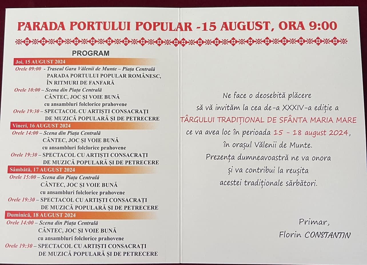 De Sfânta Maria Mare, orașul Vălenii de Munte se îmbracă din nou în straie tradiționale, de sărbătoare. De joi, 15 august, și până pe 18 august, localitatea prahoveană poate fi un punct de atracție pentru cei care sunt liberi și vor să petreacă seri pline de muzică românească, să guste produse tradiționale sau vestita țuică de Văleni! Primarul orașului Vălenii de Munte ne îmbie să mergem la sărbătoare, printr-un mesaj transmis pe pagina sa de Facebook: ”Cu ocazia sărbătorii de Sfânta Maria Mare, vă invit, joi 15 august, ora 09:00, să participați la “Parada Portului Popular”, un eveniment special ce va celebra frumusețea și autenticitatea tradițiilor noastre. Evenimentul va marca și deschiderea Târgului Tradițional de Sfânta Maria Mare, care va avea loc în perioada 15-18 August. Târgul va oferi o gamă variată de produse tradiționale, bucate alese și momente artistice. Vă aștept cu drag să sărbătorim împreună tradițiile și obiceiurile care ne definesc!”, ne invită la Văleni edilul Florin Constantin. Programul zilelor de sărbătoare:
