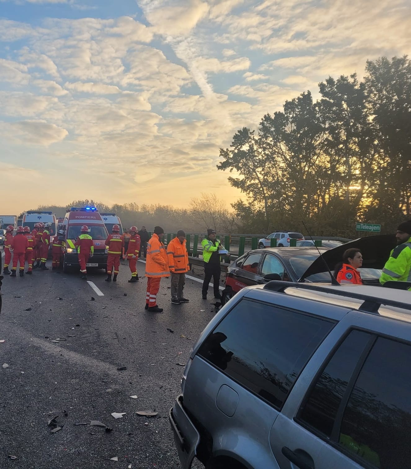 Update ora 08:00: În coliziune au fost implicate 12 autoturisme, 26 persoane au fost evaluate și asistate medical la locul evenimentului, toate conștiente, o singură persoană fiind transportată la spital - un bărbat de 44 ani, cu traumatism cranio-cerebral.