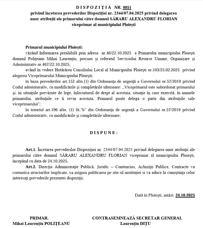 Primarul municipiului Ploiești, Mihai Polițeanu, a semnat vineri, 24 octombrie, dispoziția (foto jos) prin care retrage toate atribuțiile viceprimarului AUR, Alexandru Săraru, pe fondul unor acuzații grave și al unui conflict mocnit între cei doi, escaladat în ultimele luni atât administrativ, cât și în spațiul public.
