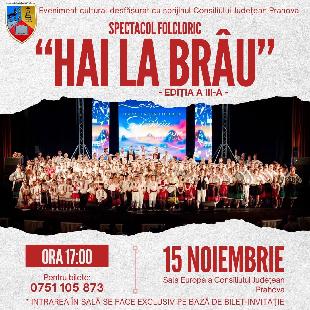 ASOCIAŢIA FOLCLORICĂ “BRÂU MUNTENESC” organizează sâmbătă, 15 noiembrie, în intervalul 17.00 – 19.00, la Sala Europa a Consiliului Județean Prahova, spectacolul folcloric ”Hai la Brâu!”, ediția a III-a. Spectacolul se realizează cu sprijinul exclusiv al Consiliului Județean Prahova, care și-a dovedit, o dată în plus, implicarea în păstrarea și transmiterea mai departe a tradițiilor românești.